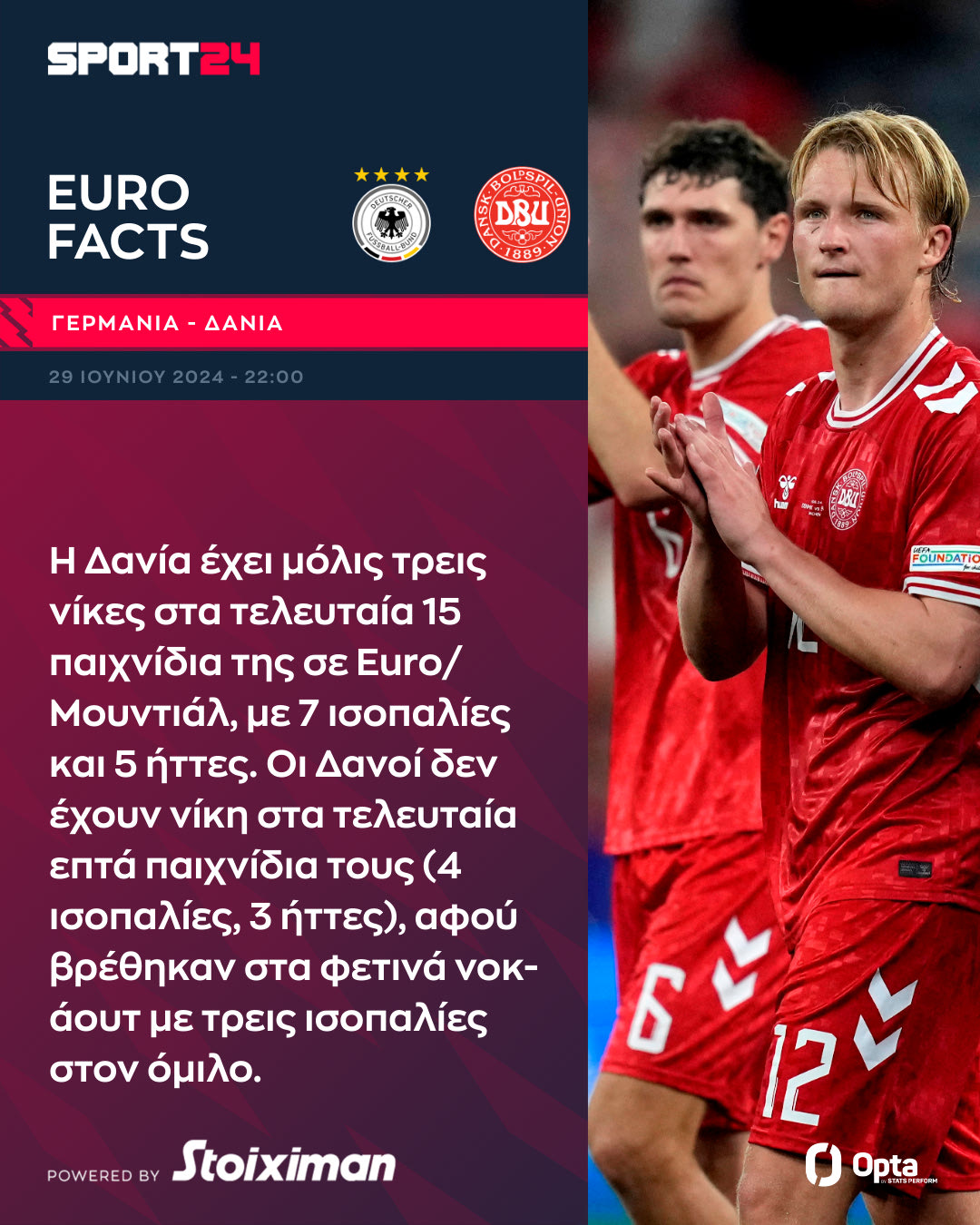 Η εθνική Γερμανίας δίνει κόντρα στη σκληροτράχηλη Δανία το πρώτο μεγάλο της τεστ στο Euro 2024, με τη "Μάνσαφτ" να καλείται να υπερασπιστεί τον τίτλο του φαβορί που της έχει δοθεί. Το SPORT24 με την αξιοπιστία της Opta σας παρουσιάζει μερικά facts για την αναμέτρηση που κλείνει την πρώτη ημέρα της φάσης των 16 της διοργάνωσης.