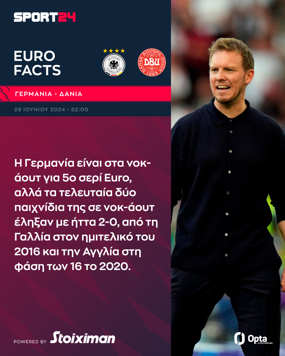Η Γερμανία είναι στα νοκ-άουτ για 5ο σερί Euro, αλλά τα δύο τελευταία παιχνίδια της σε νοκ-άουτ έληξαν με ήττα 2-0, από τη Γαλλία στον ημιτελικό του 2016 και την Αγγλία στους 16 το 2020.