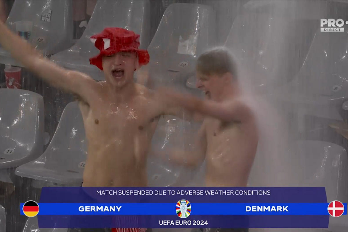 Ενώ οι περισσότεροι φίλαθλοι έδειξαν να δυσαρεστούνται από τον καιρό, υπήρχαν κι αυτοί που το διασκέδαζαν. Όπως δύο Δανοί φίλαθλοι που τους έπιασε ο φακός να χαίρονται ενώ είχαν γίνει μούσκεμα από το νερό και χωρίς τις μπλούζες τους.