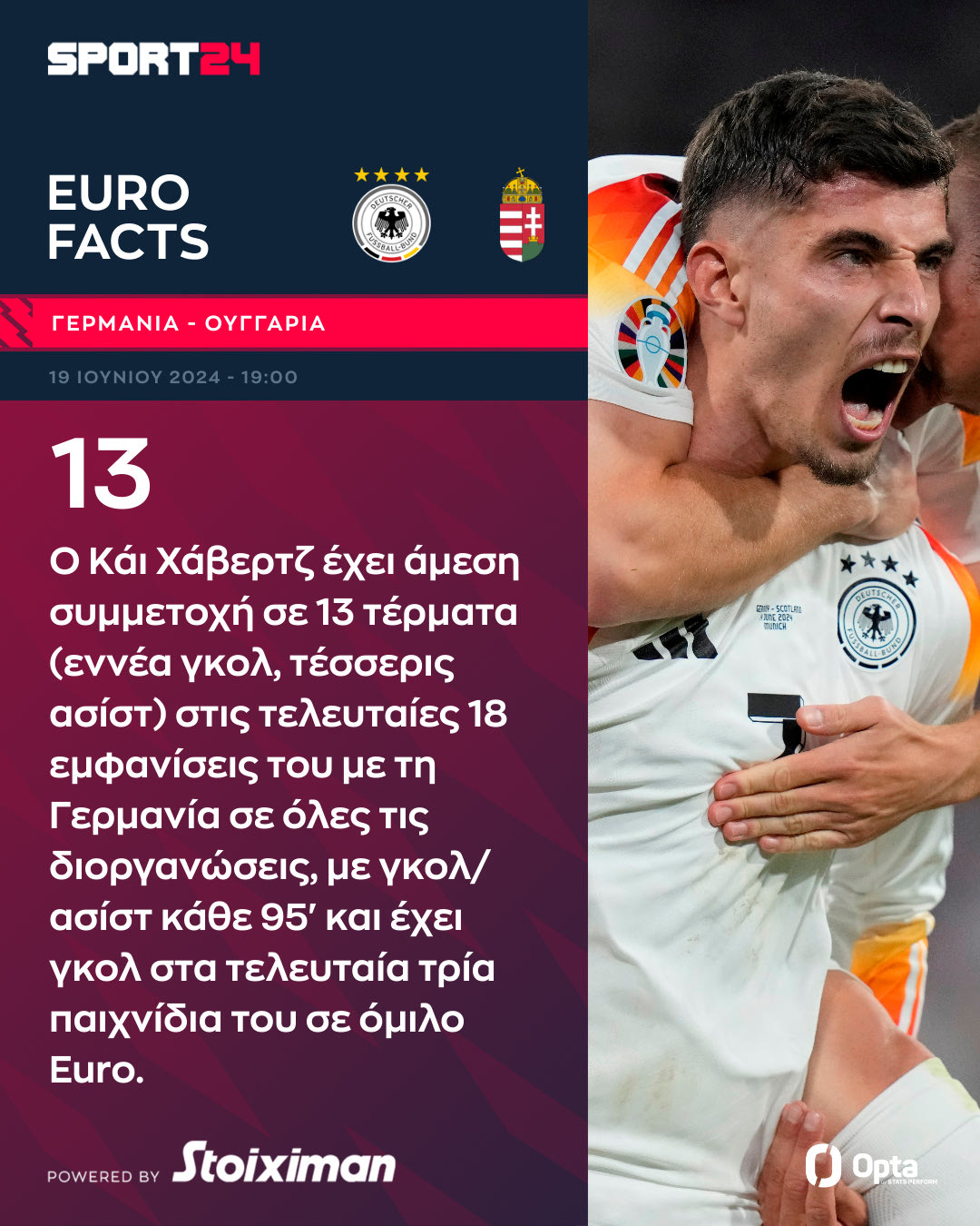 Ο Κάι Χάβερτζ έχει άμεση συμμετοχή σε 13 τέρματα (εννέα γκολ, τέσσερις ασίστ) στις τελευταίες 18 εμφανίσεις του με τη φανέλα της Γερμανίας σε όλες τις διοργανώσεις, με γκολ/ασίστ κάθε 95 λεπτά. Ο Χάβερτζ έχει γκολ στα τελευταία τρία παιχνίδια του σε όμιλο Euro.