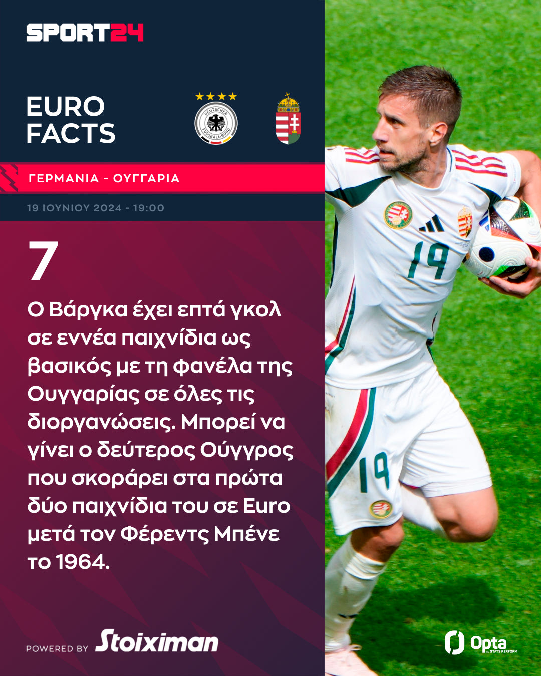 Με την ψυχολογία στα ύψη μετά την άκρως εντυπωσιακή της πρεμιέρα, η Γερμανία υποδέχται την Ουγγαρία, που καίγεται για θετικό αποτέλεσμα έπειτα από την ήττα της από την Ελβετία. Το SPORT24 σας παρουσιάζει μερικά χρήσιμα Facts ενόψει της σπουδαίας αναμέτρησης, πάντα με τη βοήθεια της Opta.
