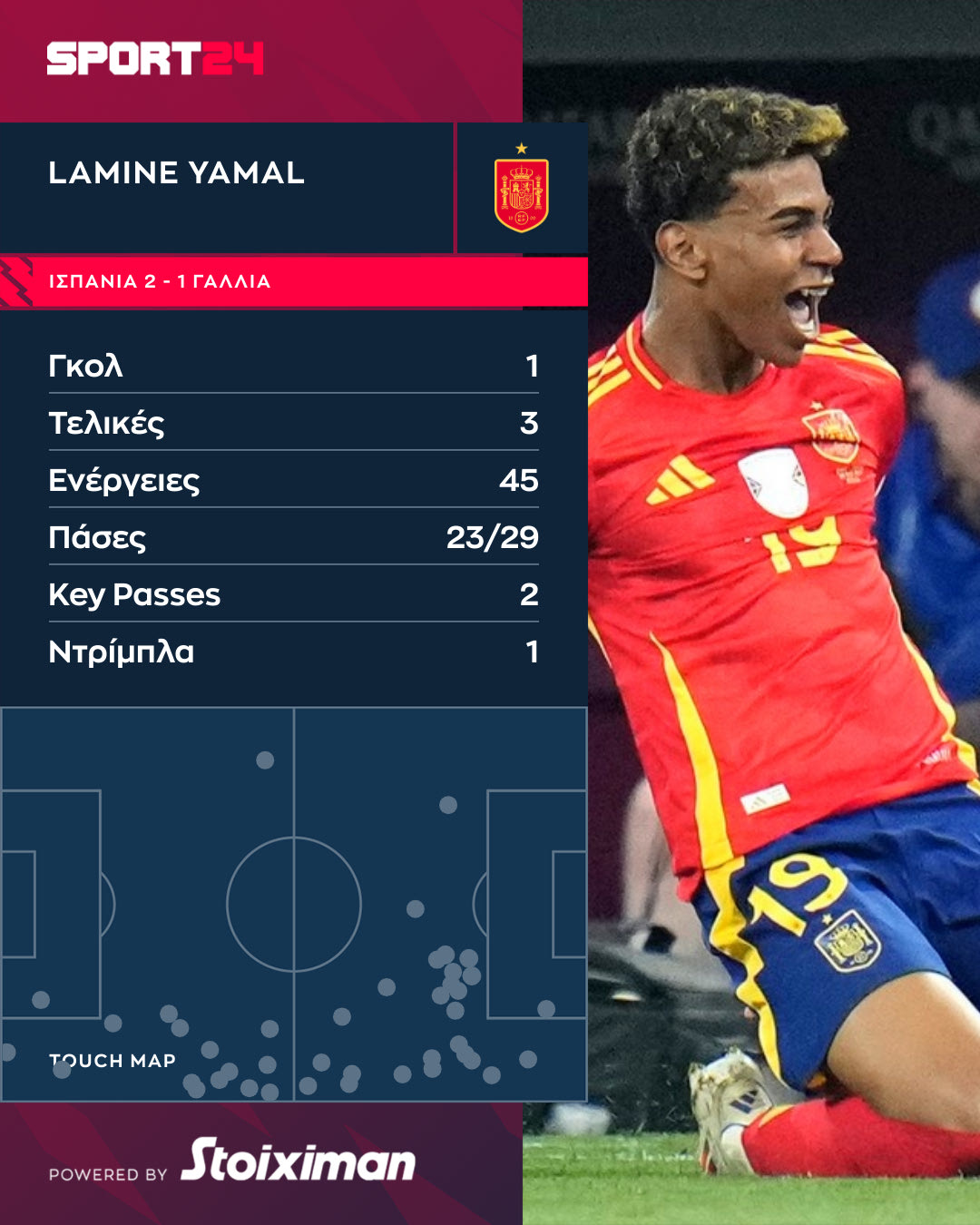 Η ενέργεια που ίσως άλλαξε όλο το παιχνίδι ήταν η γκολάρα του Γιαμάλ για το 1-1, δίνοντας την απαραίτητη ώθηση στη ρόχα. Δείτε αναλυτικά όλες τις ενέργειες του 16χρονου κόντρα στους Bleus.