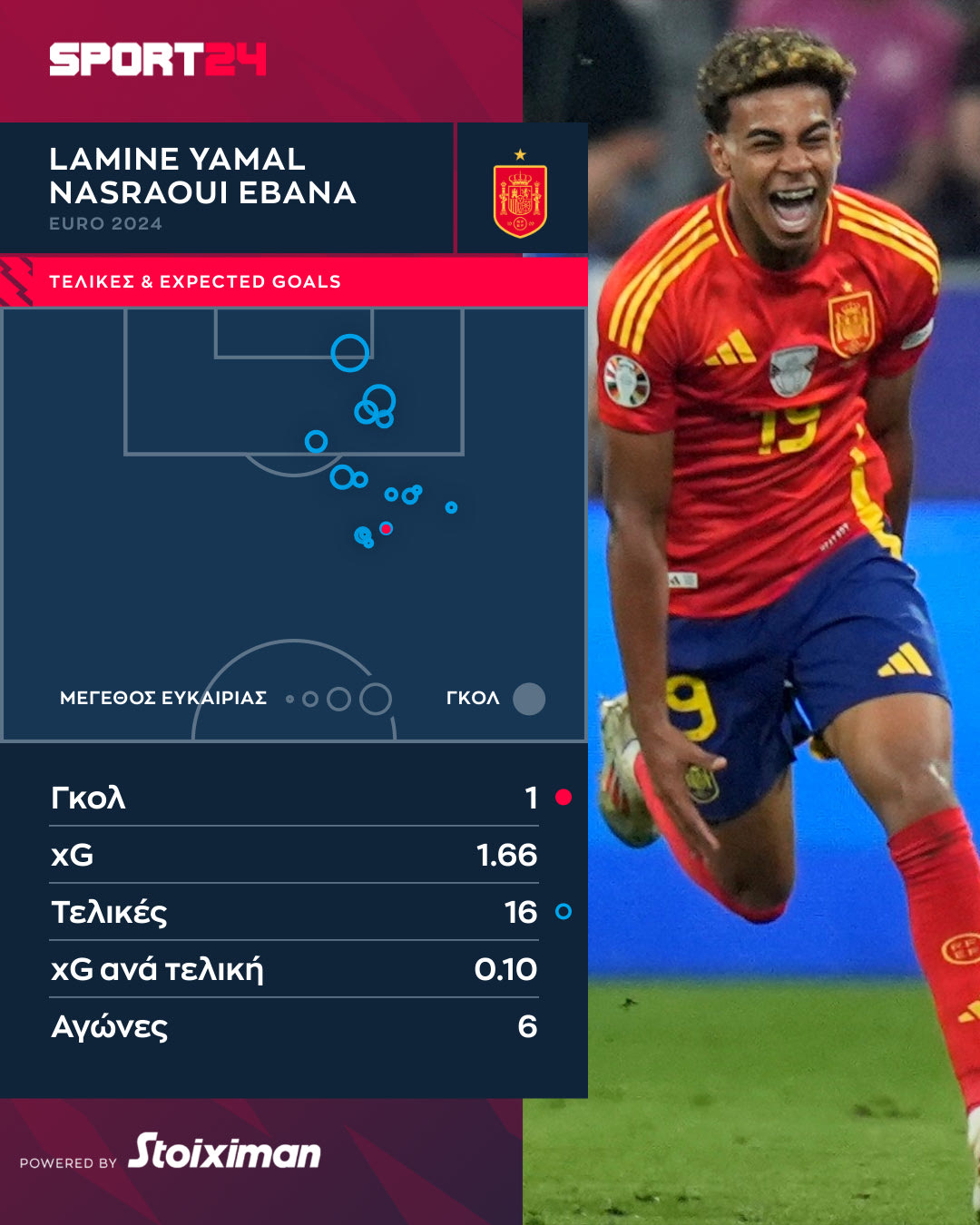 Ο Γιαμάλ είναι η αλήθεια πως θα μπορούσε να πετύχει γκολ νωρίτερα σε αυτό το Euro. Sυνολικά στο τουρνουά έχει κάνει συνολικά 16 τελικές.