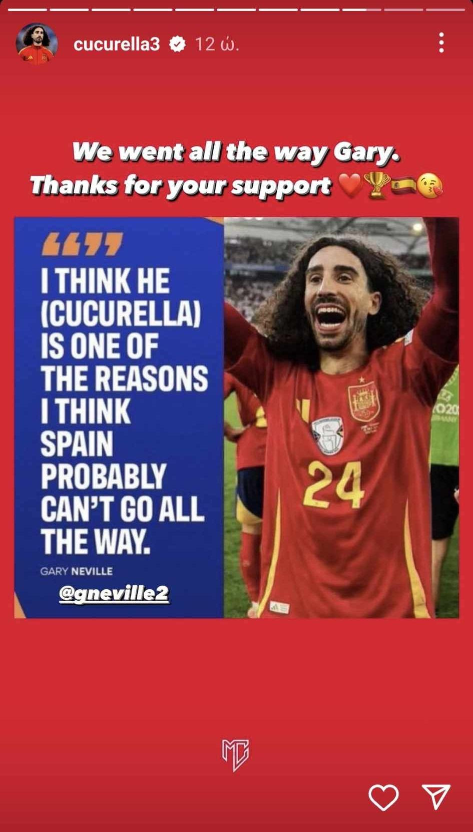 Ο Μαρκ Κουκουρέγια με Instagram story απάντησε στον Γκάρι Νέβιλ για την πρόσφατη δήλωση που είχε κάνει ο Άγγλος παλαίμαχος, τρολάροντάς τον.