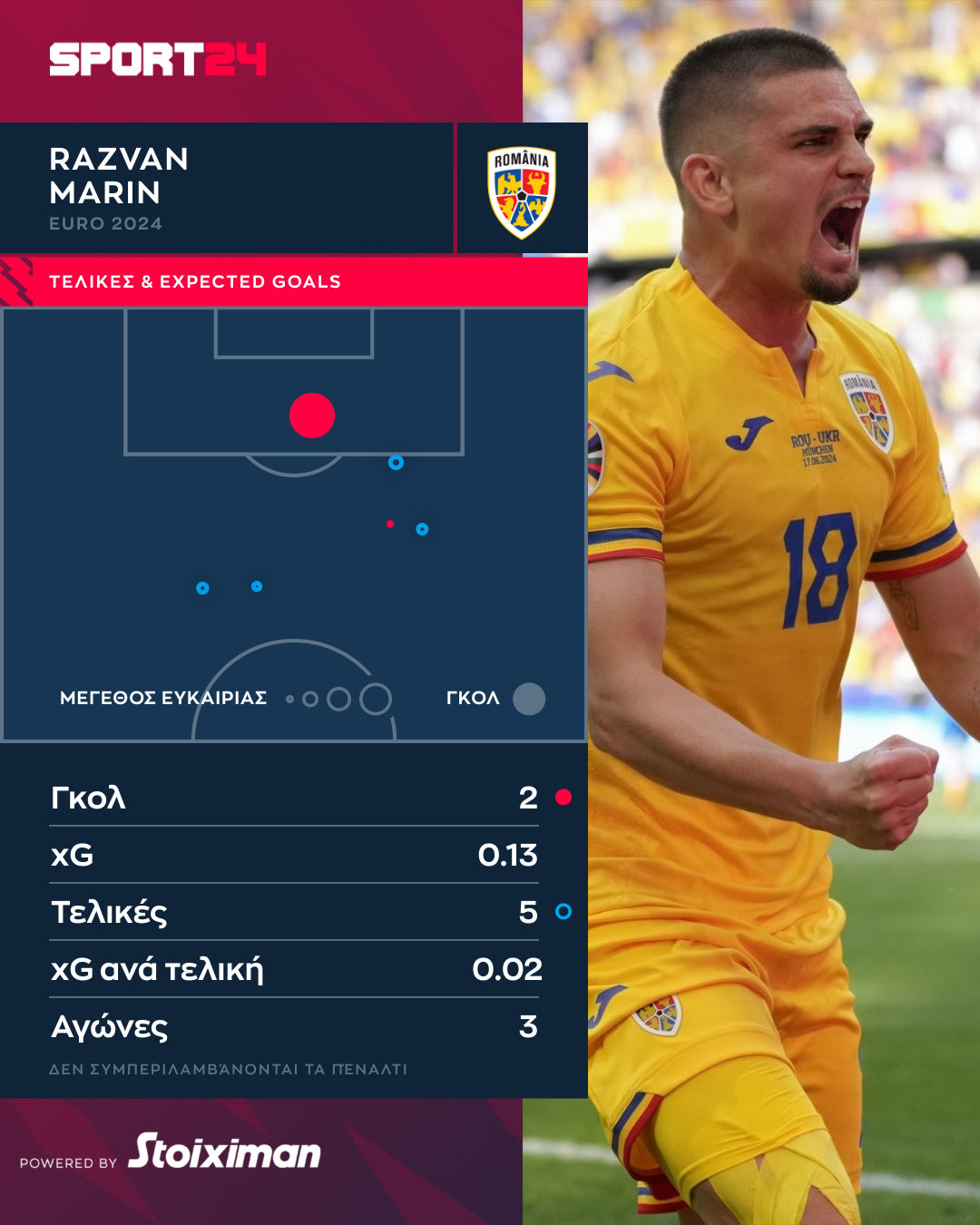 Ο Ρουμάνος στα τρία ματς στους ομίλους είχε πέντες σουτ, όλα εκτός περιοχής και πέτυχε ένα γκολ. Η συνολική αξία των πέντε τελικών προσπαθειών του ήταν 0.13 xGoals και ο μέσος όρος των τελικών προσπαθειών του φτάνει το 0.02.