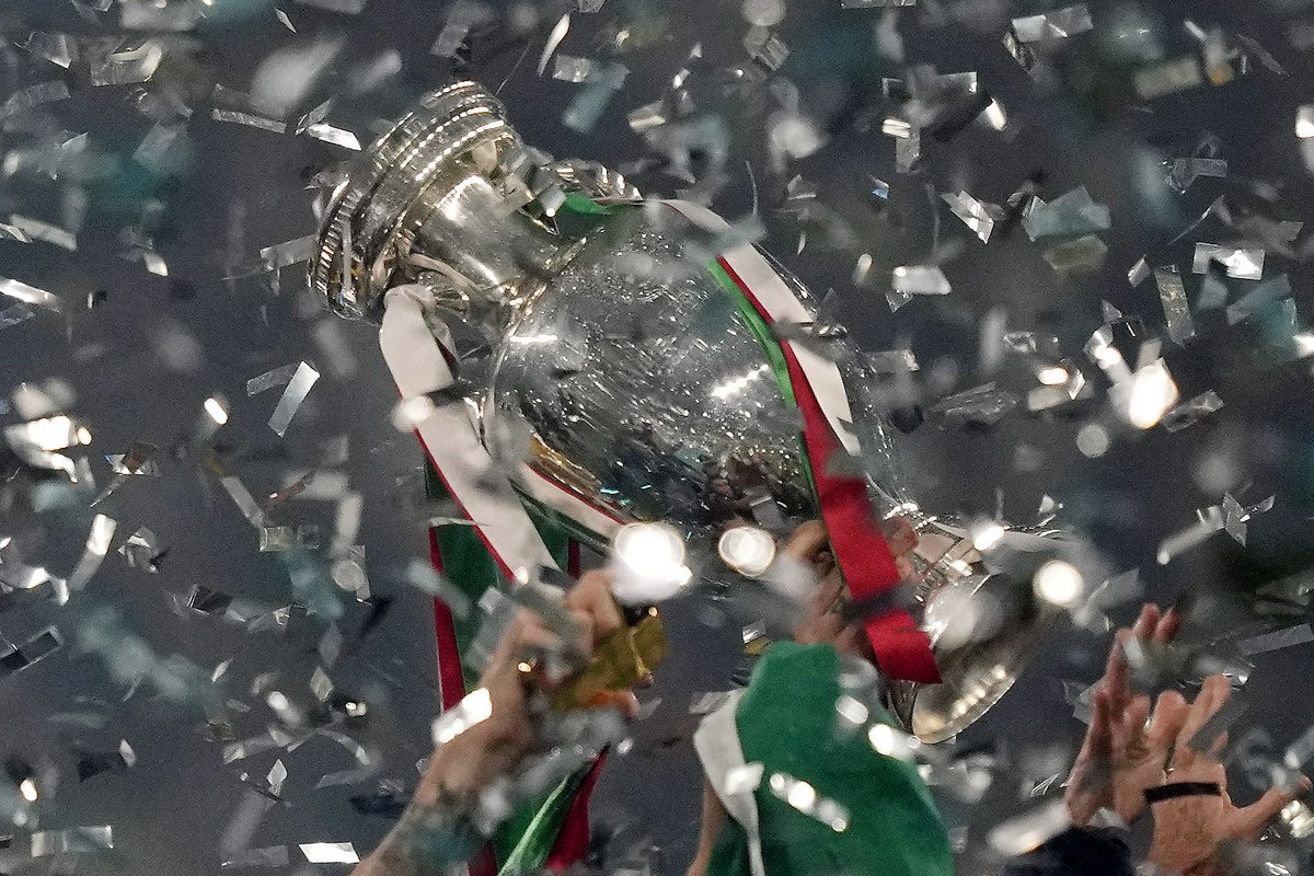 Italy's team celebrates with the trophy after winning the Euro 2020 soccer championship final between England and Italy at Wembley stadium in London, Sunday, July 11, 2021. UEFA has decided the future of soccers European Championship for the next decade. The United Kingdom and Ireland will host in 2028 and an unusual Italy-Turkey co-hosting plan was picked for 2032. (AP Photo/Frank Augstein, Pool, File)
