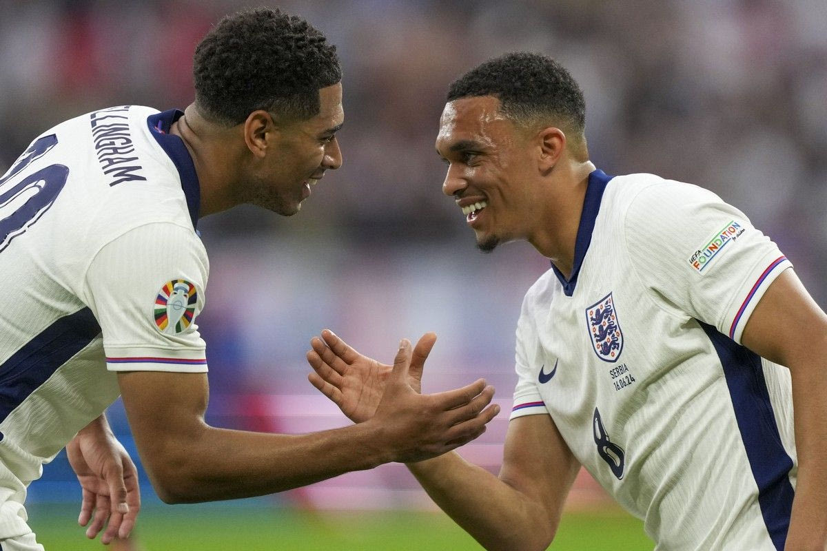 England's Jude Bellingham, left, celebrates with England's Trent Alexander-Arnold after scoring the opening goal during a Group C match between Serbia and England at the Euro 2024 soccer tournament in Gelsenkirchen, Germany, Sunday, June 16, 2024. (AP Photo/Martin Meissner) AP