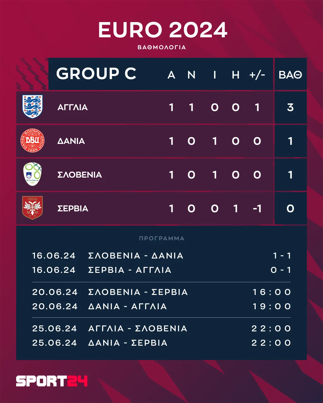 Δείτε πώς διαμορφώθηκε η βαθμολογία του 3ου ομίλου του Euro 2024 μετά τη νίκη της Αγγλίας επί της Σερβίας και την ισοπαλία ανάμεσα στη Σλοβενία και τη Δανία.