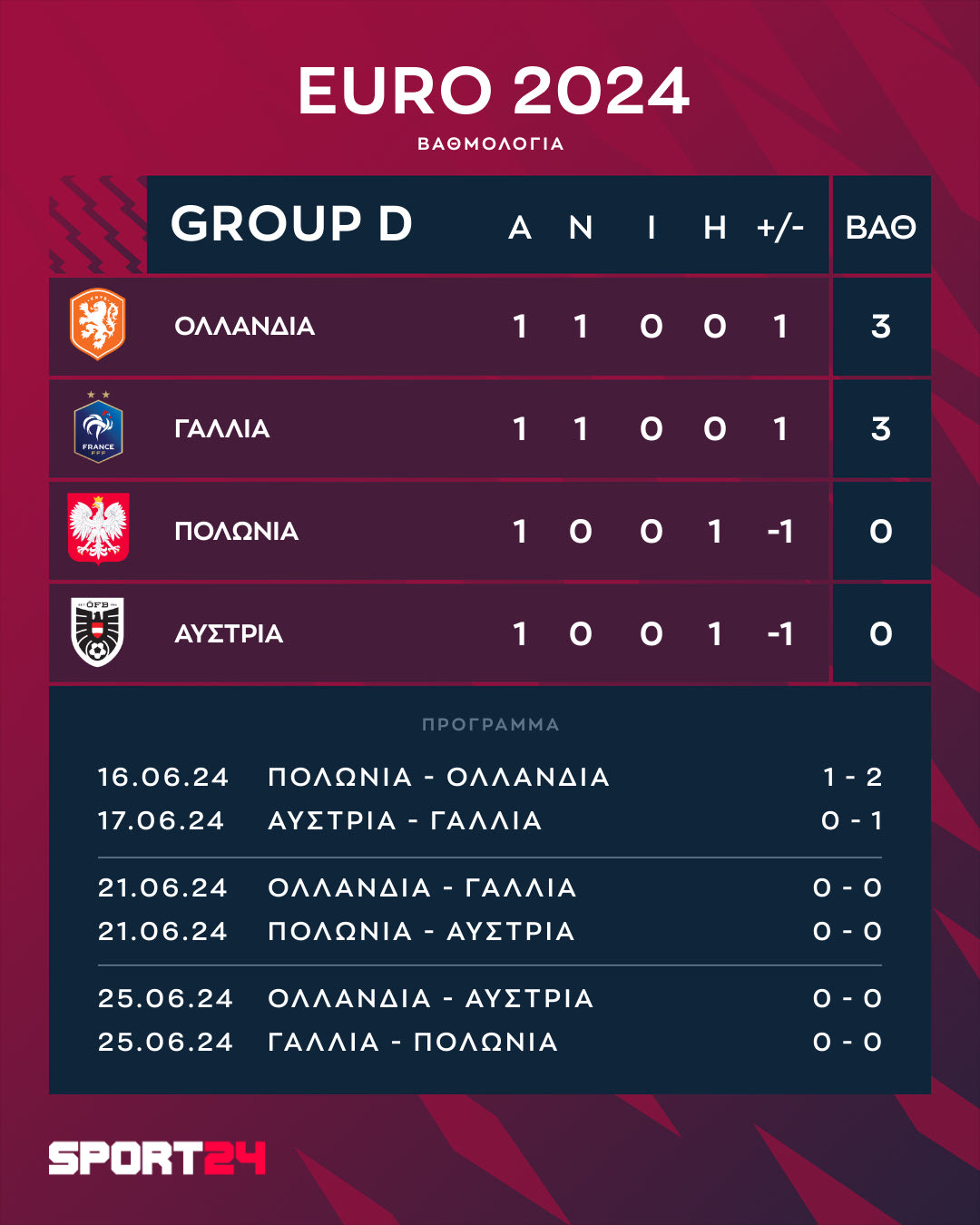Δείτε πώς διαμορφώθηκε η βαθμολογία του 4ου ομίλου του Euro 2024 μετά τη νίκη της Γαλλίας επί της Αυστρίας με 1-0 και την επικράτηση της Ολλανδίας επί της Πολωνίας με 2-1.