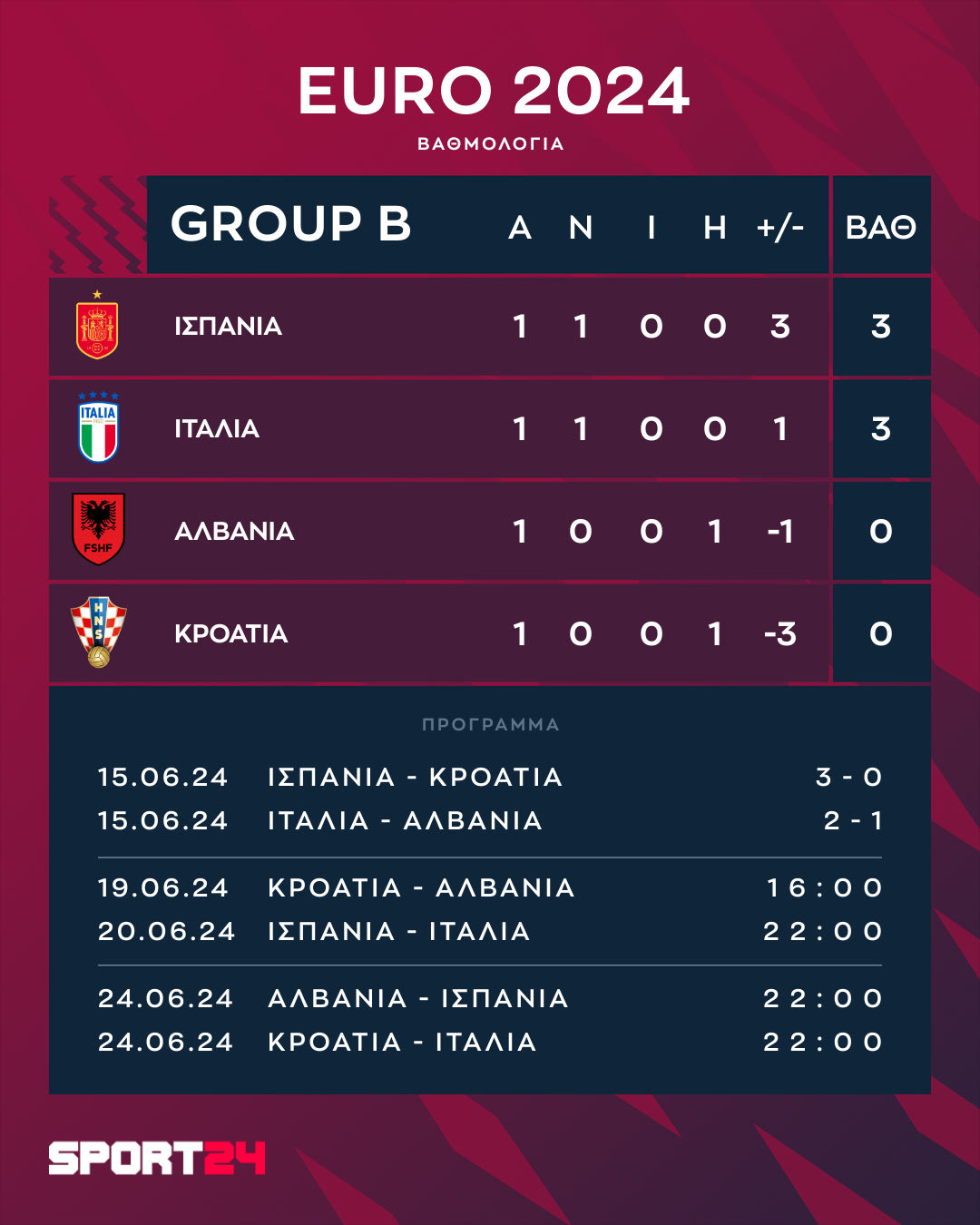 Euro 2024: Η βαθμολογία του Β’ ομίλου μετά τις νίκες Ισπανίας και Ιταλίας