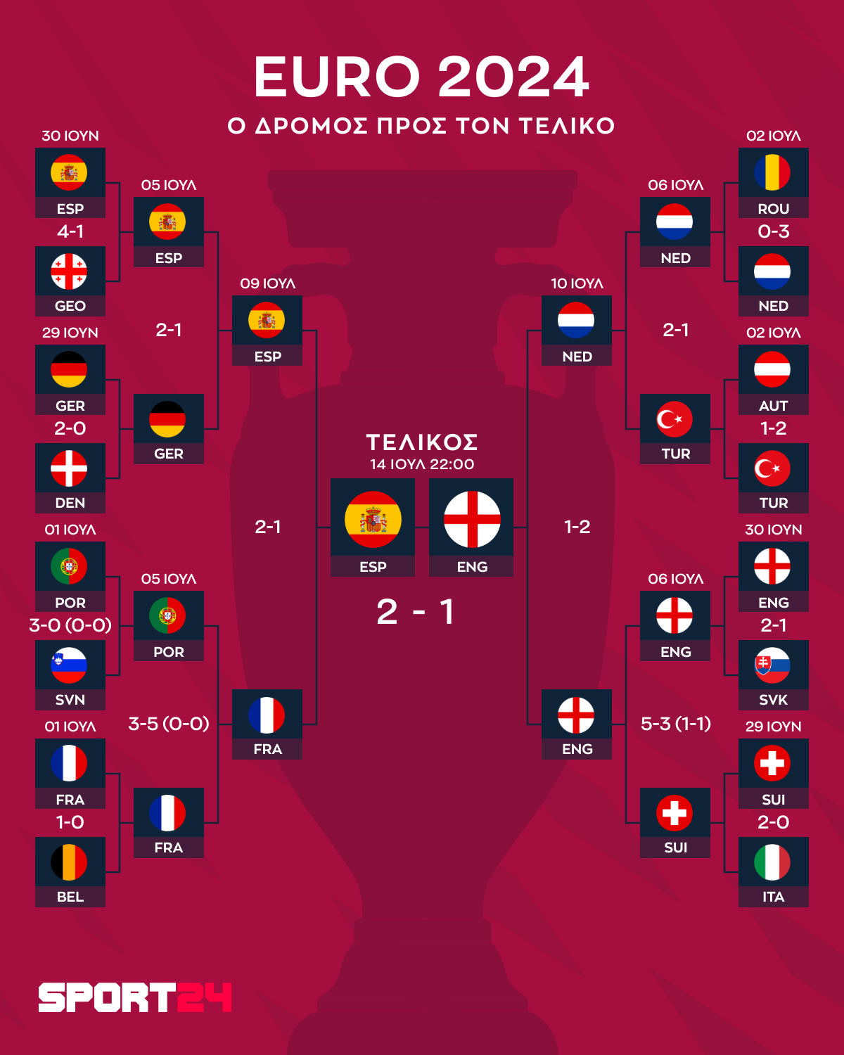 Η εκπληκτική σε όλο το Euro 2024 Ισπανία υπέταξε στον τελικό με 2-1 την μαχητική Αγγλία, χάρη σε χρυσό γκολ του Ογιαρθάμπαλ στο 86ο λεπτό και αναδείχτηκε πανάξια πρωταθλήτρια Ευρώπης για τέταρτη φορά στην ιστορία της.