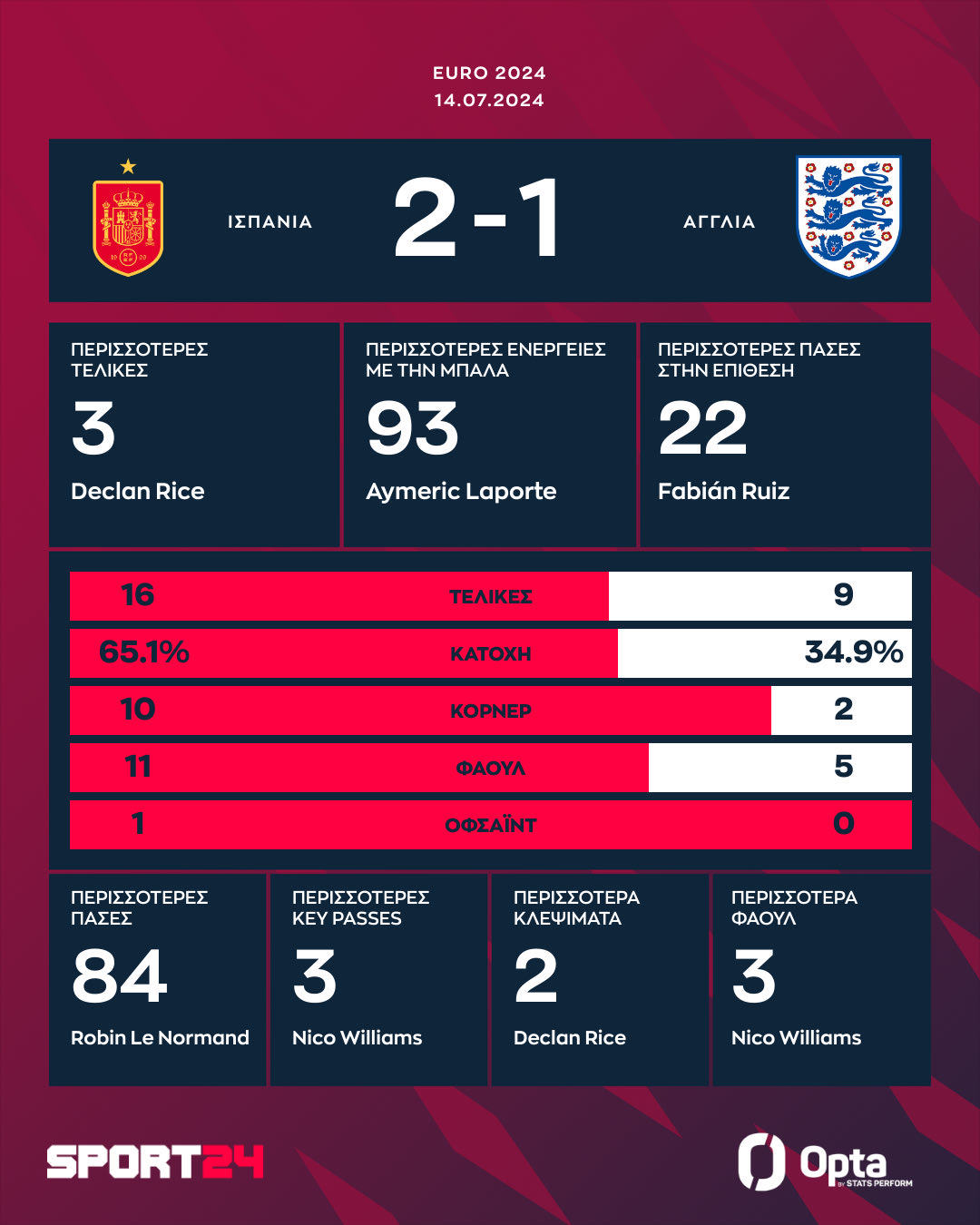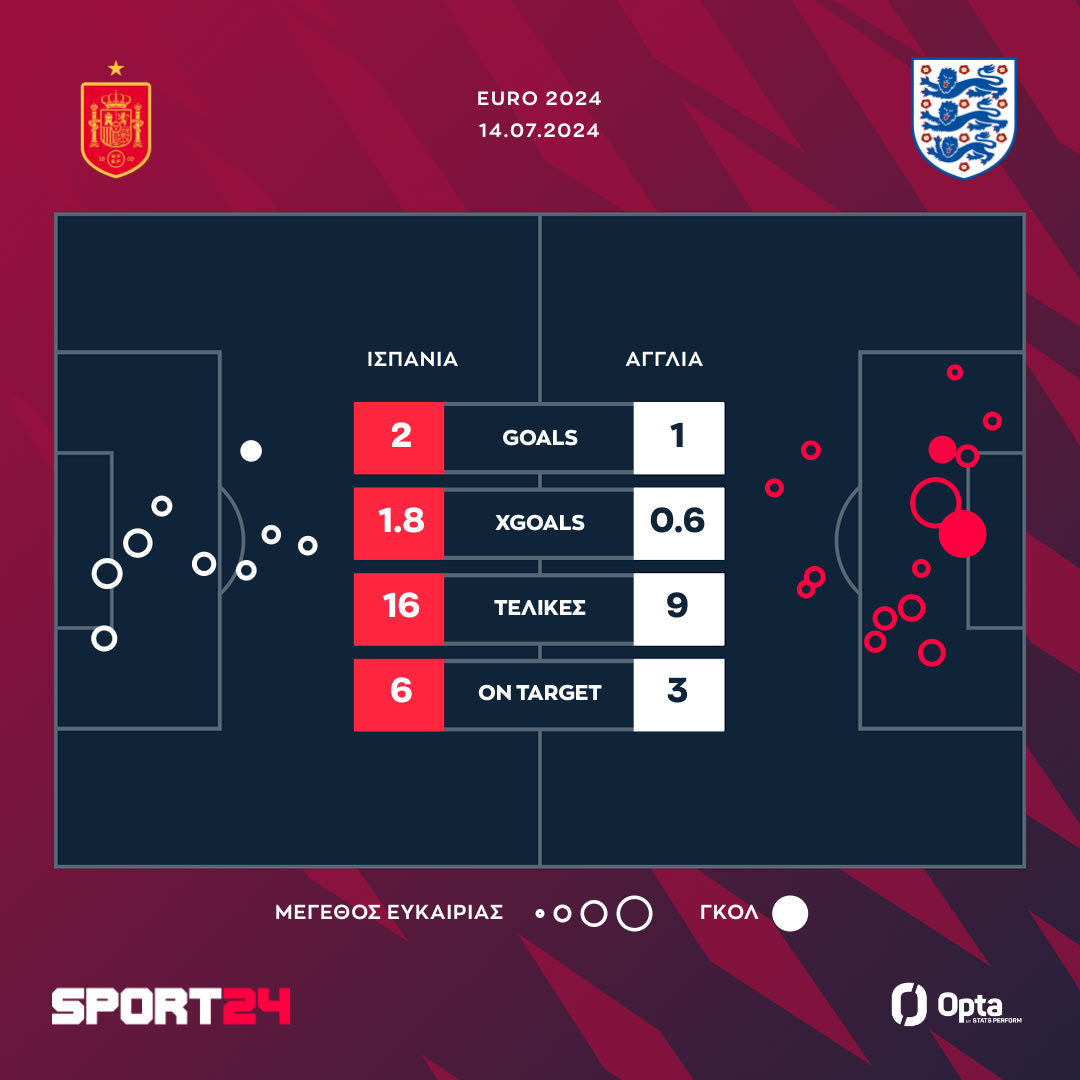 Πρωταγωνιστές τα δύο βέλη της Ισπανίας στις φτερούγες της επίθεσης, με τον Γιαμάλ να βρίσκει τον Γουίλιαμς σε θέση βολής εντός περιοχής της Αγγλίας με φοβερή κάθετη πάσα (4η ασίστ του στο Euro 2024) και τον δεύτερο να εκτελεί τον Πίκφορντ με αριστερό πλασέ στην κίνηση (1-0).