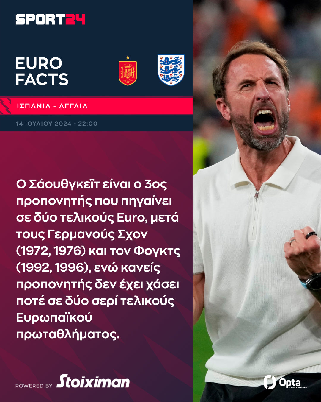 Δύο διαφορετικές σχολές ποδοσφαίρου συγκρούονται στον τελικό του Euro 2024, αυτός της Ισπανίας και της Αγγλίας. Το SPORT24 με την αξιοπιστία της Opta σας παρουσιάζει μερικά facts για την ιστορική αναμέτρηση που ίσως βγάλει αληθινό ένα τραγούδι του 1996.