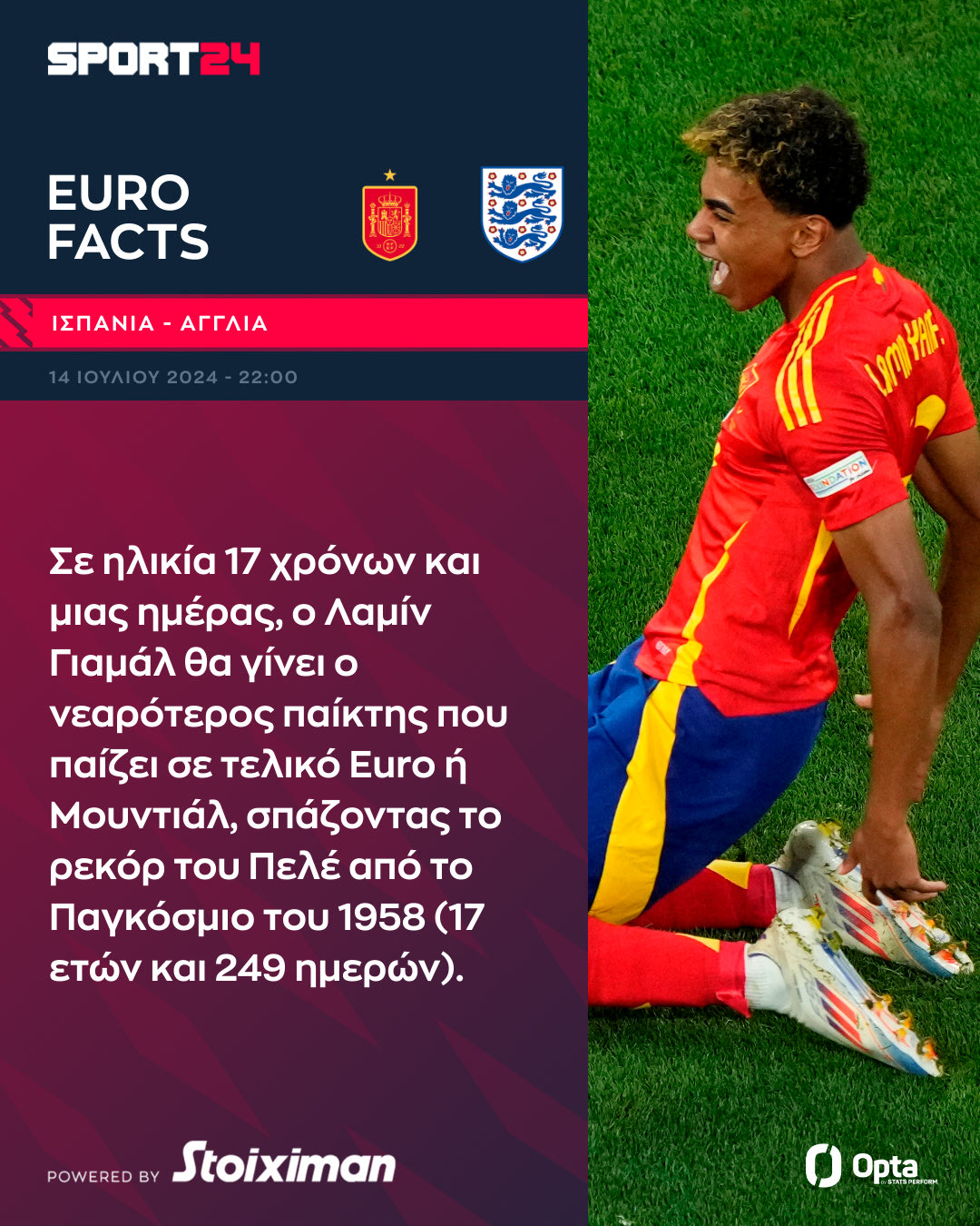 Σε ηλικία 17 ετών και μίας ημέρας, ο Ισπανός Λαμίν Γιαμάλ θα γίνει ο νεότερος παίκτης που έχει συμμετάσχει ποτέ σε τελικό Παγκοσμίου Κυπέλλου ή Euro, ξεπερνώντας το ρεκόρ του Πελέ από το Μουντιάλ του 1958 (17 ετών και 249 ημερών). Μέχρι στιγμής έχει τρεις ασίστ στο Euro 2024, ενώ κανένας Ισπανός δεν έχει δώσει ποτέ τέσσερις σε ένα μόνο Ευρωπαϊκό Πρωτάθλημα.