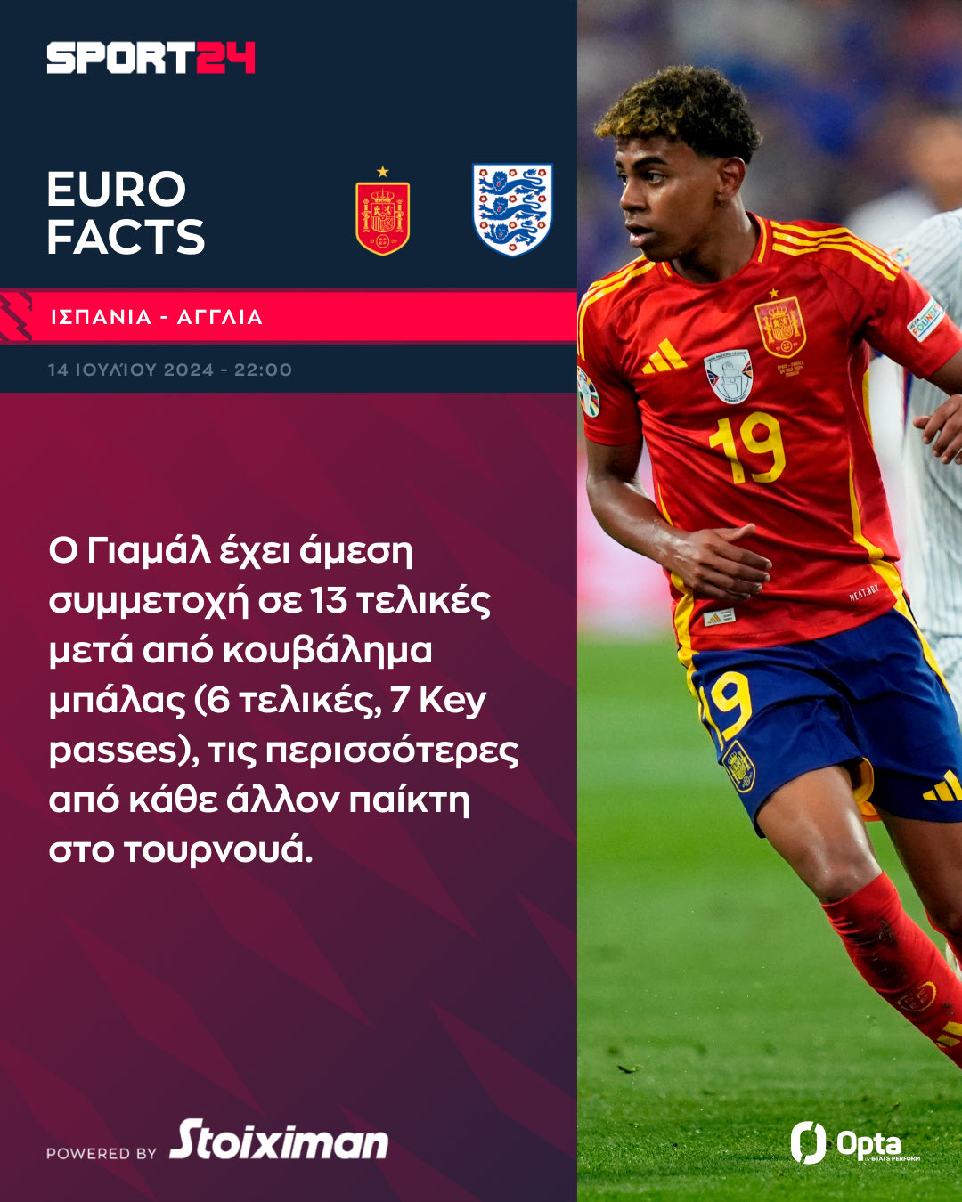 Ο Ισπανός Λαμίν Γιαμάλ έχει άμεση συμμετοχή σε 13 τελικές μετά από κουβάλημα μπάλας (6 σουτ, 7 key passes), τουλάχιστον τρεις περισσότερες από κάθε άλλον παίκτη του τουρνουά.