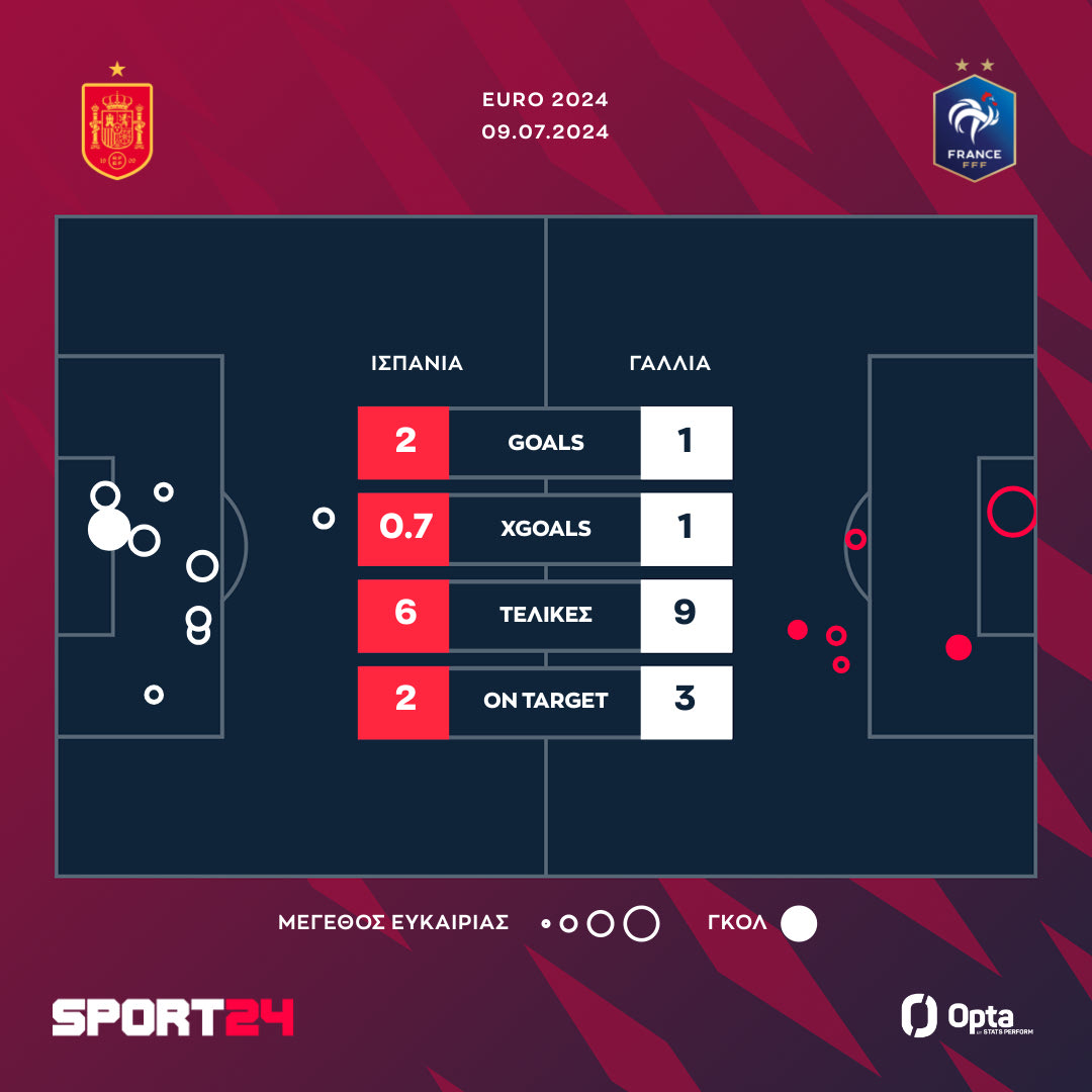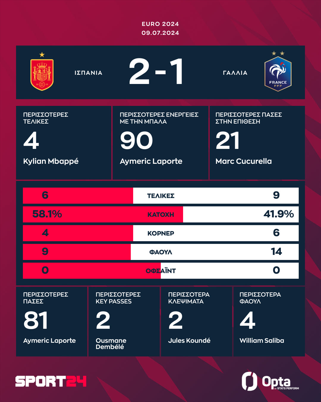 Κάτι κεφαλιές των Γάλλων δεν κατάφεραν να βρουν λύση και το τελευταίο σφύριγμα βρήκε τους Ισπανούς να πανηγυρίζουν την μεγάλη πρόκρισή τους στον τελικό του Euro 2024.