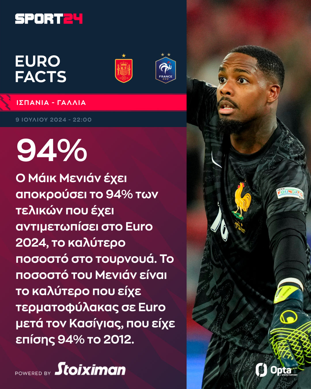 Ο Μάικ Μενιάν έχει αποκρούσει το 94% των τελικών που έχει αντιμετωπίσει στο Euro 2024, το καλύτερο ποσοστό στο τουρνουά. Το ποσοστό του Μενιάν είναι το καλύτερο που είχε τερματοφύλακας σε Euro μετά τον Κασίγιας, που είχε επίσης 94% το 2012.