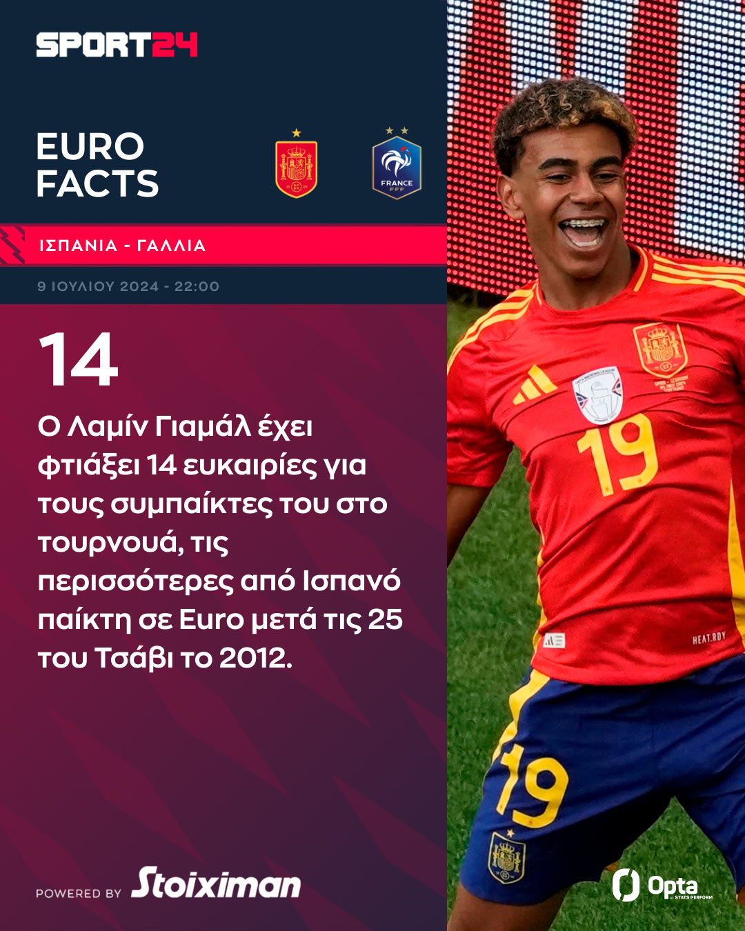 Ο Λαμίν Γιαμάλ έχει φτιάξει 14 ευκαιρίες για τους συμπαίκτες του στο τουρνουά, τις περισσότερες από Ισπανό παίκτη σε Euro μετά τις 25 του Τσάβι το 2012. Ο Γιαμάλ έχει τρεις ασίστ, τις περισσότερες που είχε ποτέ Ισπανός σε ένα Euro, ενώ οι 14 ευκαιρίες είναι ρεκόρ για έφηβο παίκτη σε μεγάλο τουρνουά (από το 1966 σε Μουντιάλ και το 1980 σε Euro).