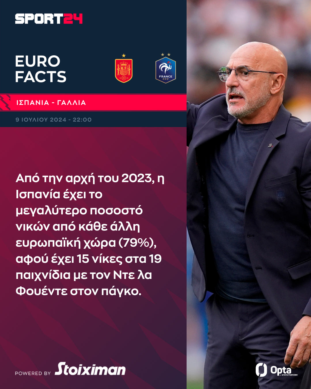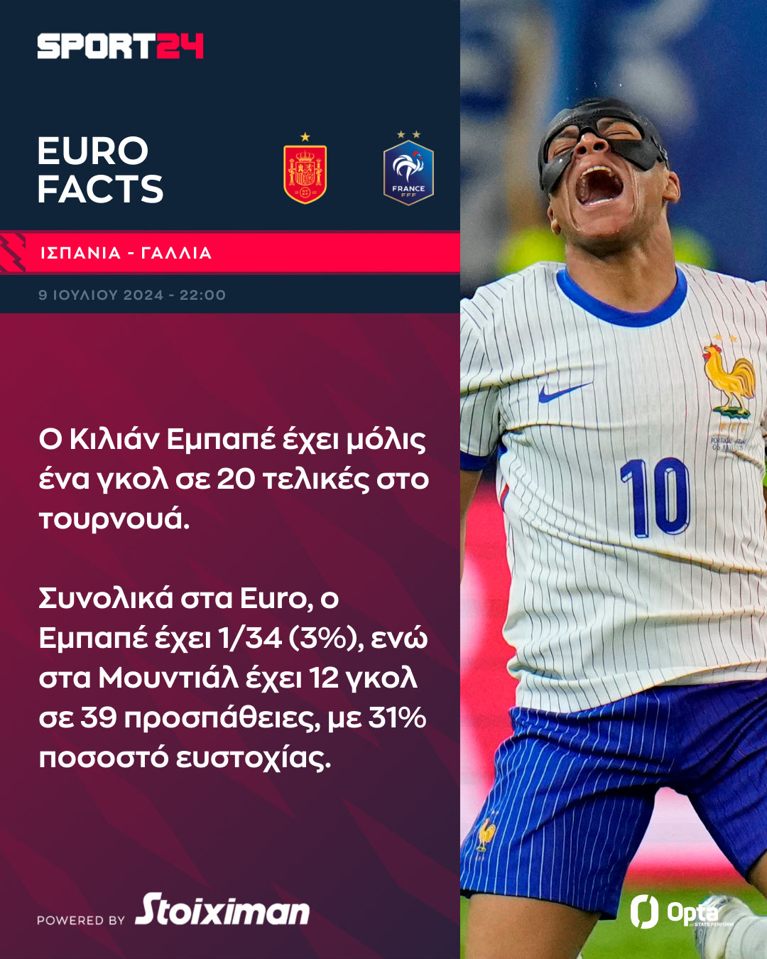 Ισπανία και Γαλλία μονομαχούν (9/7, 22:00, ΕΡΤ1, LIVE SPORT24) για ένα εισιτήριο στον τελικό του Euro 2024 στις 14 Ιουλίου. Δείτε μερικά χρήσιμα στοιχεία με τη βοήθεια της Opta.