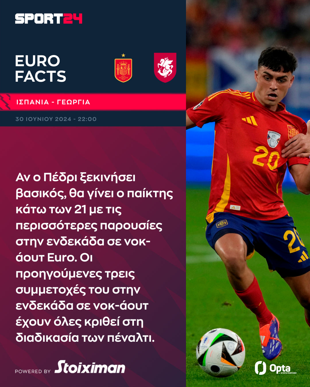 Αν ο Πέδρι ξεκινήσει βασικός, θα γίνει ο παίκτης με τις περισσότερες παρουσίες στην ενδεκάδα σε νοκ-άουτ αγώνα κάτω από τα 21 χρόνια. Οι προηγούμενες τρεις συμμετοχές του στην ενδεκάδα σε νοκ-άουτ έχουν όλες κριθεί στη διαδικασία των πέναλτι.