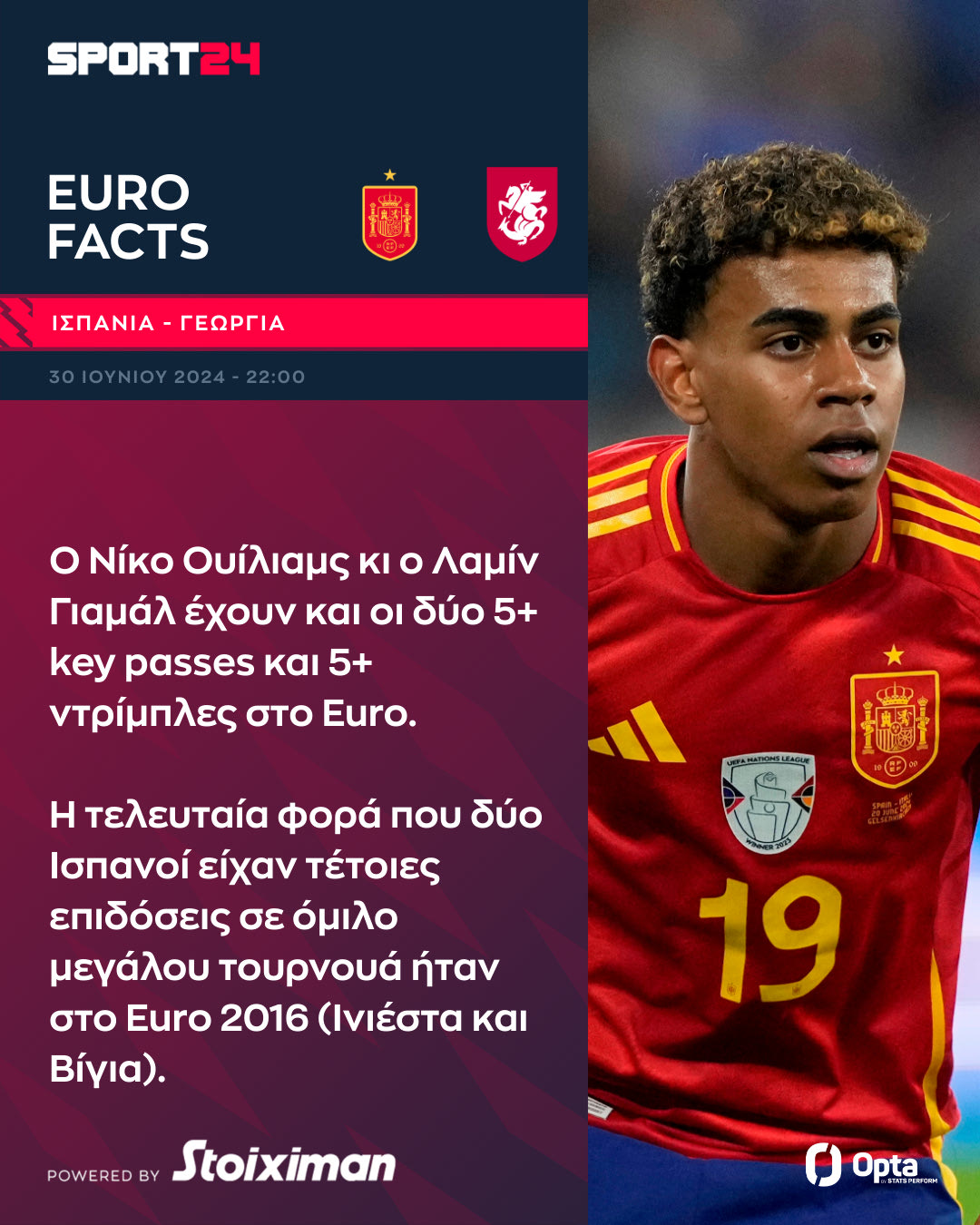 Ο Νίκο Ουίλιαμς κι ο Λαμίν Γιαμάλ έχουν και οι δύο 5+ key passes και 5+ ντρίμπλες. Η τελευταία φορά που δύο Ισπανοί είχαν τέτοιες επιδόσεις σε όμιλο μεγάλου τουρνουά ήταν στο Euro 2016 (Ινιέστα και Βίγια).