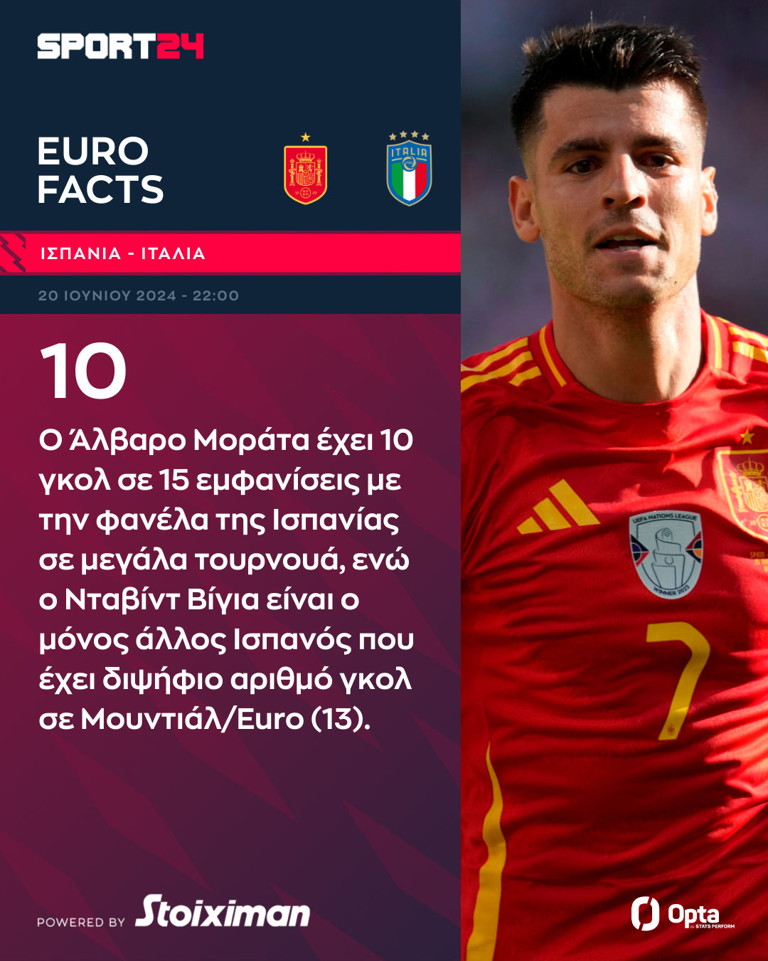 Ο Άλβαρο Μοράτα έχει 10 γκολ σε 15 εμφανίσεις με την φανέλα της Ισπανίας σε μεγάλα τουρνουά, ενώ ο Νταβίντ Βίγια είναι ο μόνος άλλος Ισπανός που έχει διψήφιο αριθμό γκολ σε Μουντιάλ/Euro.