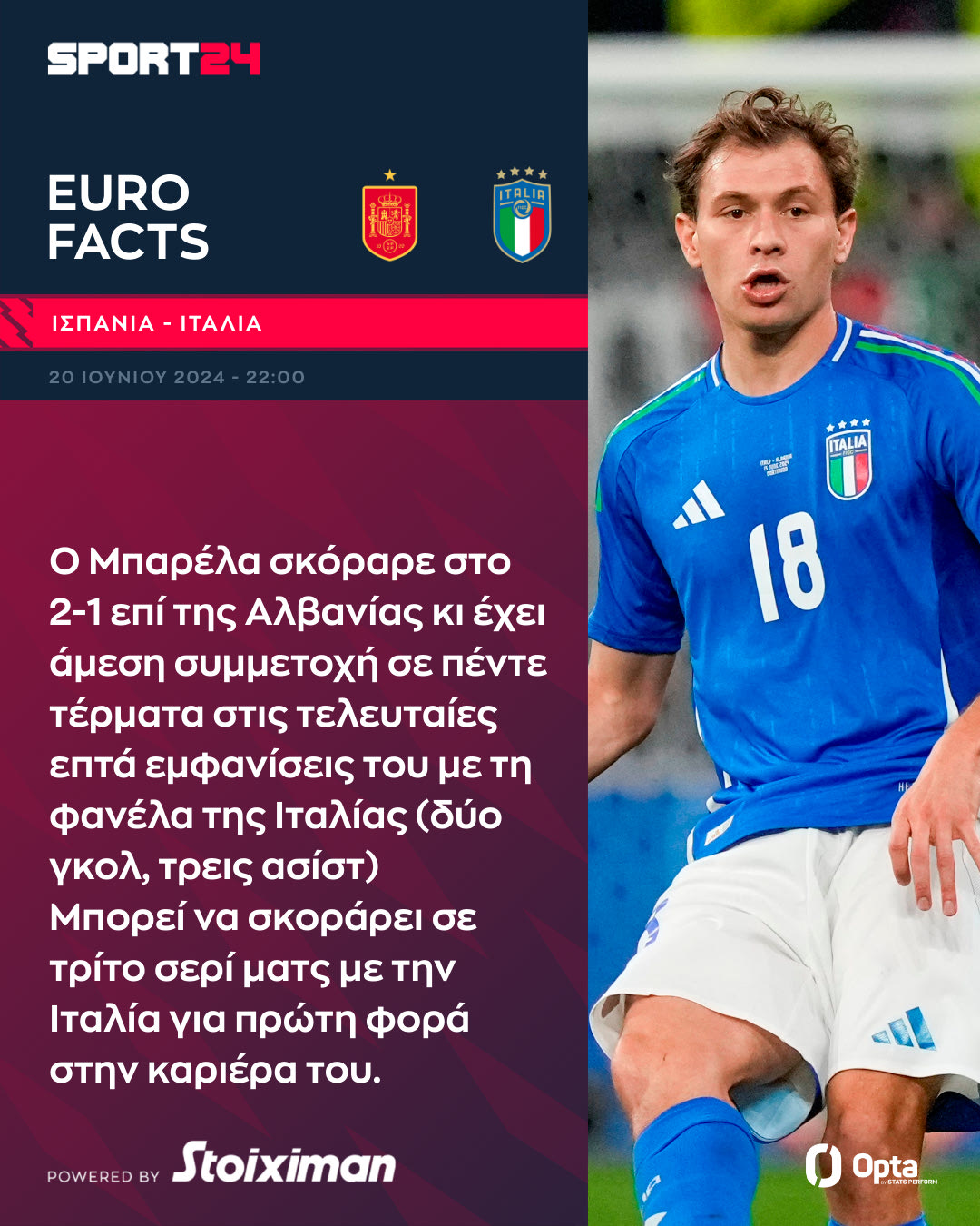Ο Νικολό Μπαρέλα σκόραρε στο 2-1 επί της Αλβανίας κι έχει άμεση συμμετοχή σε πέντε τέρματα στις τελευταίες επτά εμφανίσεις του με τη φανέλα της Ιταλίας (δύο γκολ, τρεις ασίστ).Μπορεί να σκοράρει σε τρίτο σερί ματς με την Εθνική Ιταλίας για πρώτη φορά στην καριέρα του.