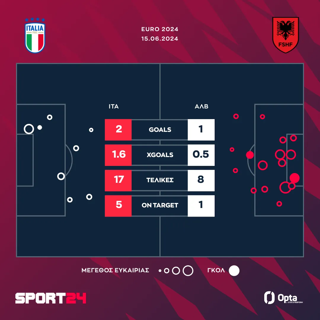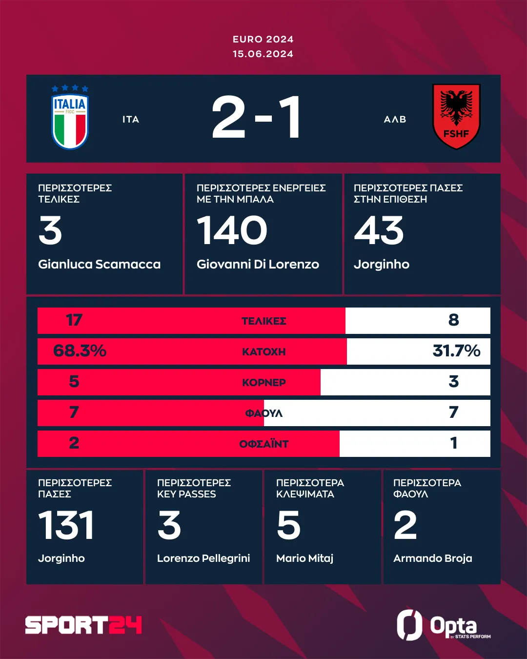 Τα στατιστικά και οι κορυφαίες επιδόσεις στο Ιταλία - Αλβανία SPORT24/OPTA