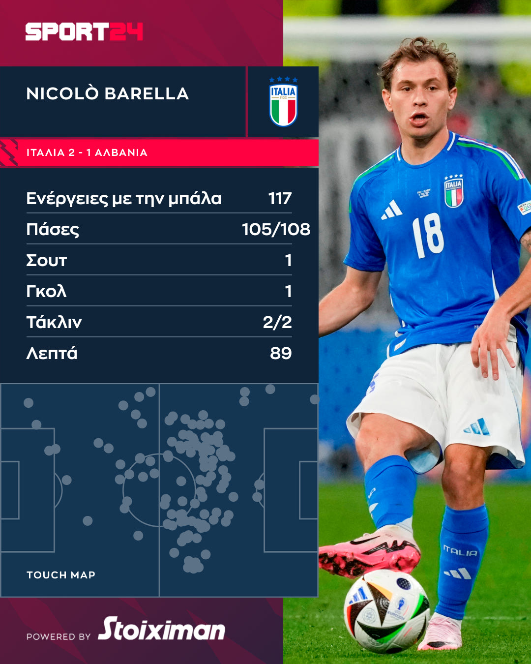 Εξαιρετική ήταν και η απόδοση του Νικολό Μπαρέλα ο οποίος στο πλευρό του Ζορζίνιο αλλά λίγο πιο μπροστά προσπάθησε να δημιουργήσει και αυτός ενώ είχε και το γκολ της νίκης για τους Ιταλούς. Και μάλιστα γκολ στο μοναδικό σουτ που επιχείρησε.