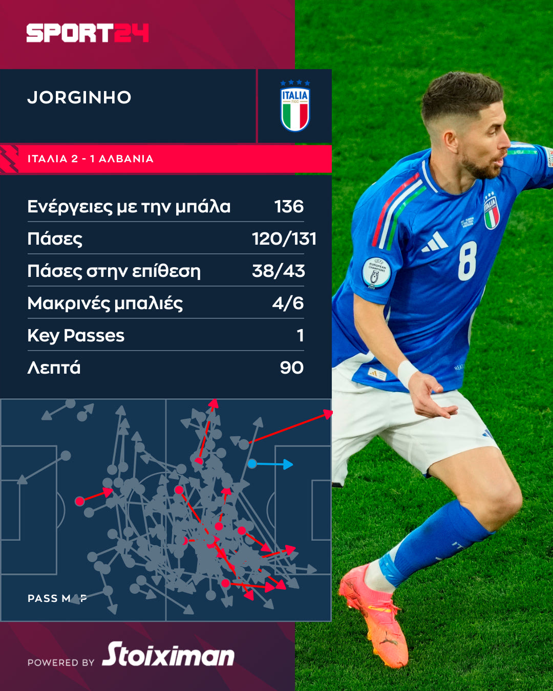 Η αρχή από τον Ζορζίνιο με τον 32χρονο μέσο από τη Βραζιλία να κάνει ρεκόρ με το καλημέρα στο Euro 2024. Στο γράφημα της Opta/Stats Perform μπορείτε να δείτε όλες του τις μεταβιβάσεις και κάποιες από τις κορυφαίες του επιδόσεις στην αναμέτρηση.