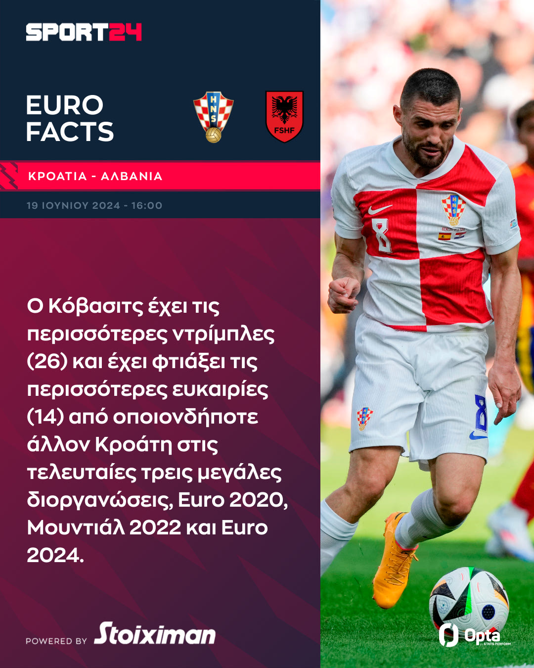 Στον δίχως αμφιβολία πιο δύσκολο όμιλο του Euro 2024 Κροατία και Αλβανία θα παίξουν τα ρέστα τους σε ένα ματς που όποιος χάσει... χάνεται. Το SPORT24 σας παρουσιάζει μερικά χρήσιμα Facts ενόψει της σπουδαίας αναμέτρησης, πάντα με τη βοήθεια της Opta.