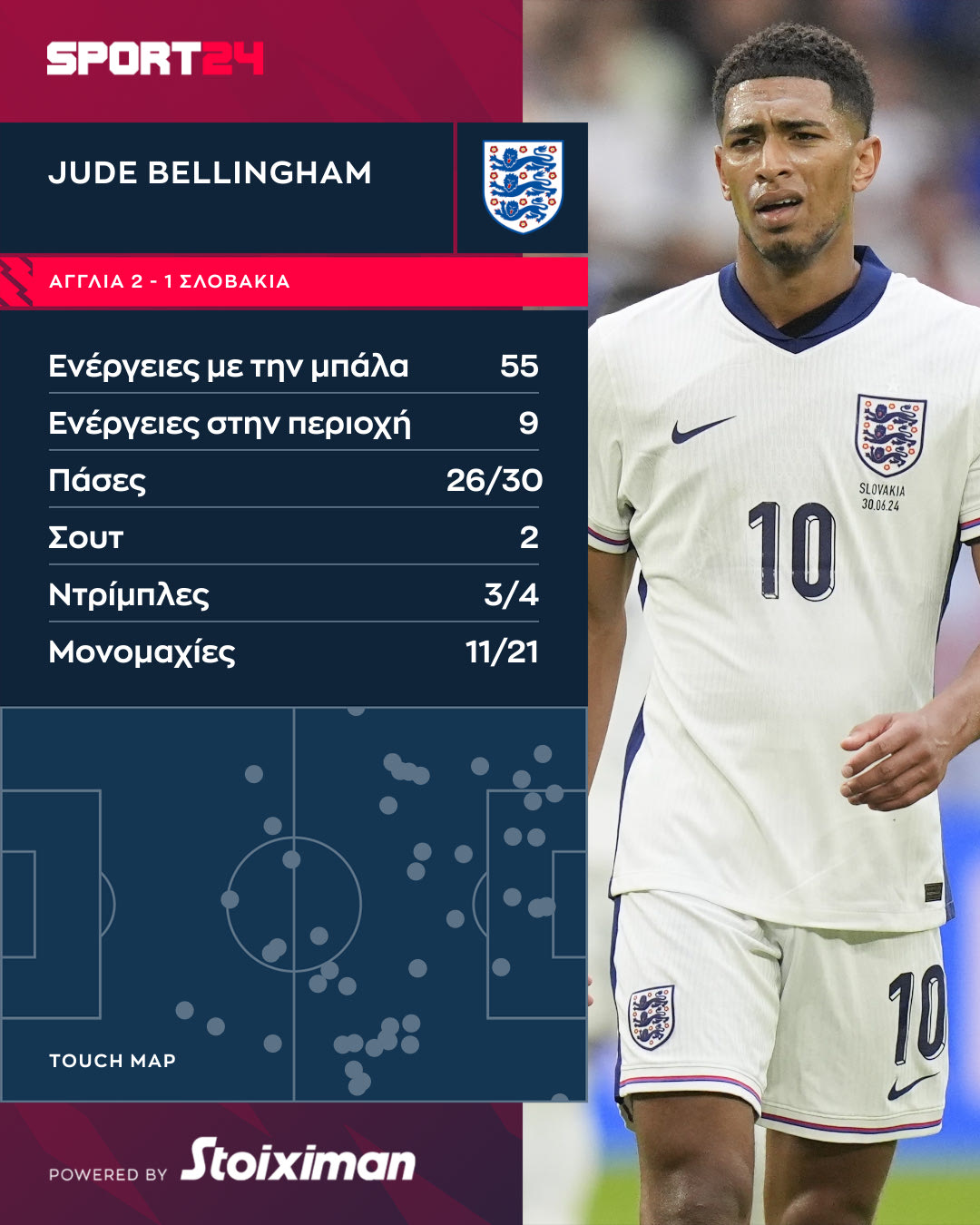 Ο Τζουντ Μπέλιγχαμ ήταν ο κορυφαίος παίκτης της Αγγλίας κόντρα στη Σλοβακία, καθώς έσωσε την παρτίδα στο 90+5' και τα τρία λιοντάρια πήραν την πρόκριση στην παράταση.
