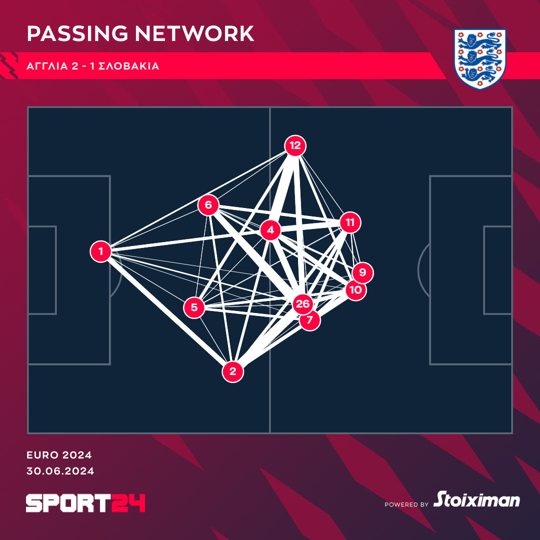 Ο Σάουθγκεϊτ κράτησε τον Μπέλιγχαμ στο “10” (η μοναδική του αλλαγή ήταν ο Μέινου αντί του Γκάλαχερ). Ο μέσος της Ρεάλ είχε έναν πιο ελεύθερο ρόλο (10) και επειδή ο Χάρι Κέιν χρειάστηκε να κατέβει πιο χαμηλά στον αγωνιστικό χώρο (9), οι δυο παίκτες είχαν τις ενέργειές τους στους ίδιους χώρους, όπως φαίνεται στο γράφημα της Opta Stats / Perform.