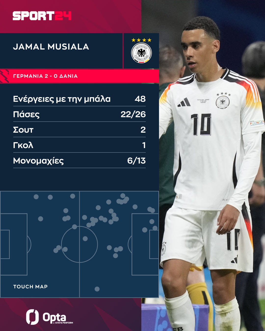 Όσα έκανε ο Μουσιάλα κόντρα στη Δανία και τι χρειάστηκε για να φτάσει τα τρία γκολ στο Euro