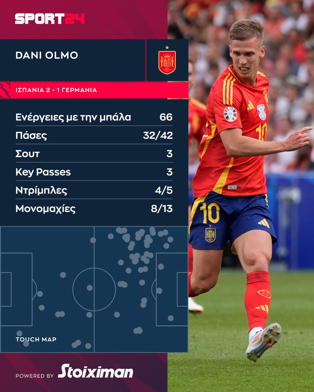 Ο Ντάνι Όλμο πέρασε στο ματς ως αλλαγή λόγω του τραυματισμού του Πέδρι και ήταν ο κορυφαίος της Ισπανίας στη νίκη επί των Γερμανών και την πρόκριση στα ημιτελικά του Euro 2024.