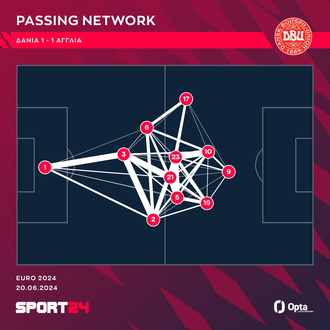 Ο Χόιμπιεργκ έπαιξε δίδυμο στη μεσαία γραμμή με τον Μόρτεν Χιούλμαντ έχοντας τους Μέλε και Κρίστιανσεν στις δύο πτέρυγες σε αυτό το 3-4-1-2 που παρατάσσονται οι Δανοί. Στην πράξη όμως, όπως βλέπουμε στο γράφημα της Opta Stats / Perform ήταν μια τριάδα καθώς ο Χοίμπιεργκ (23) είχε πλησίον του τον Χιούλμαντ (21) και τον Μέλε (5) που συνέκλινε προς τον άξονα σε αντίθεση με τον Κρίστιανσεν (17) που έμεινε στη δική του γραμμή.