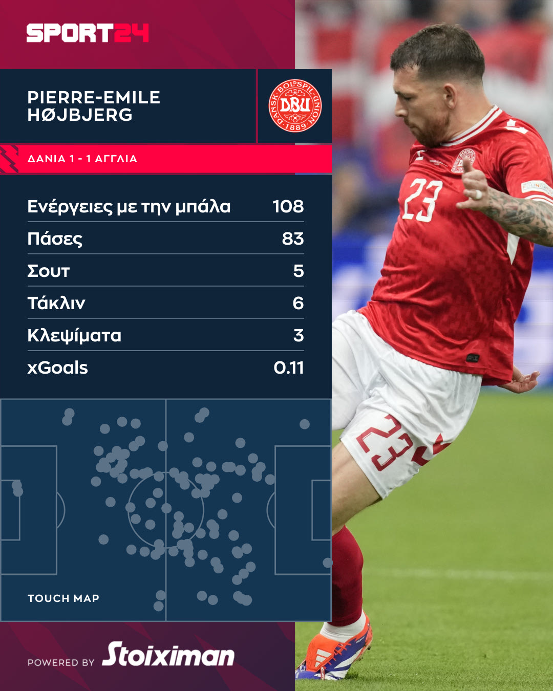 Ο Πιέρ-Εμίλ Χοίμπιεργκ πραγματοποίησε μια σπουδαία εμφάνιση κόντρα στην Αγγλία όντας ο κορυφαίος παίκτης της Δανίας κόντρα στην Αγγλία, παρότι όποια προσπάθεια εξαπέλυσε δεν παραβίασε την εστία του Πίκφορντ. Δείτε όσα έκανε ο μέσος της Τότεναμ.