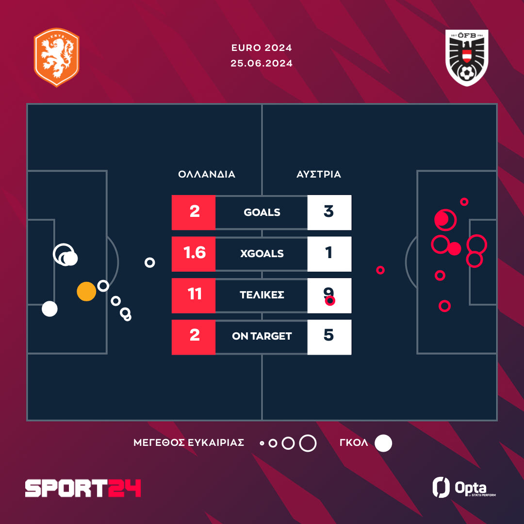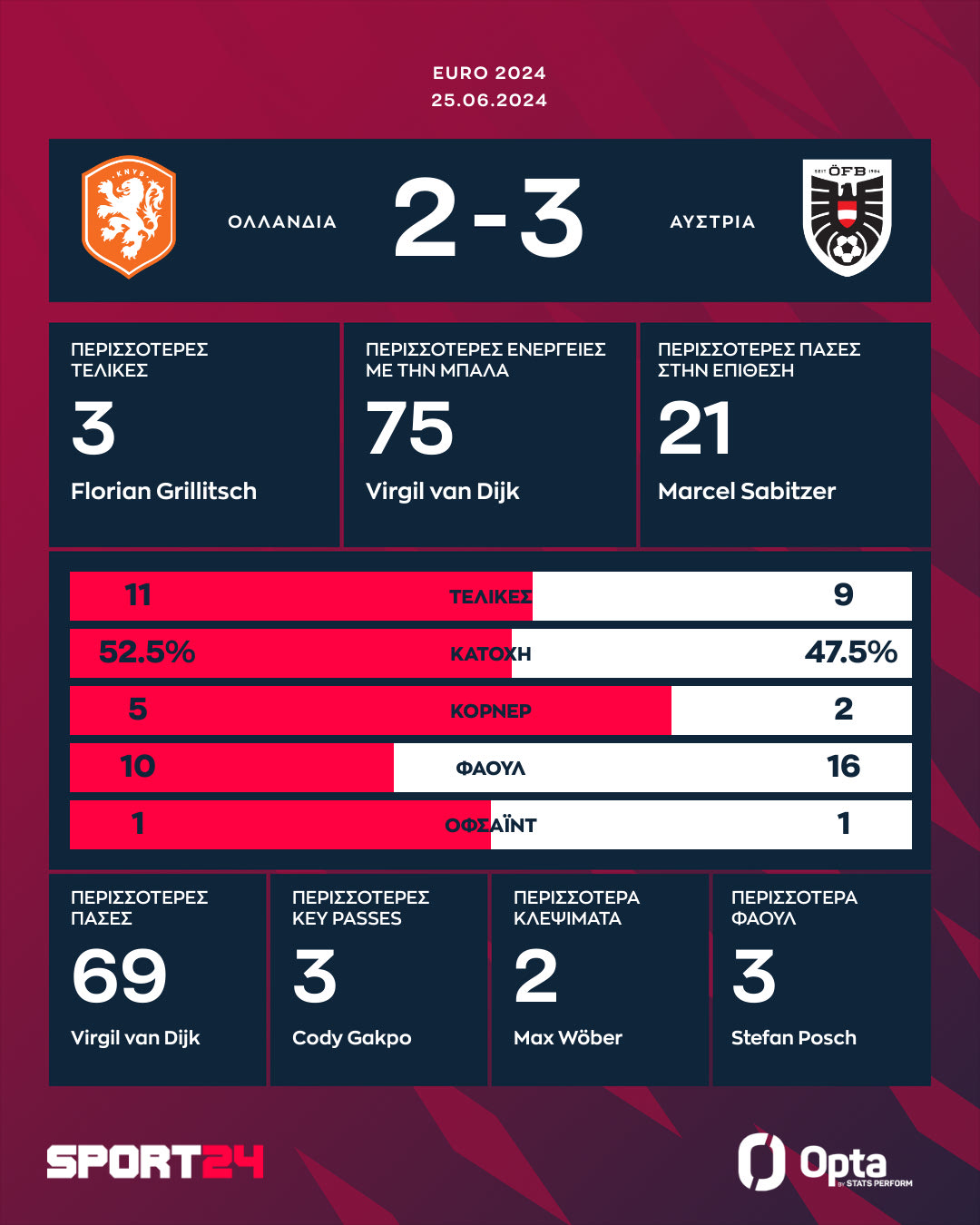 Ματσάρα έγινε στο Βερολίνο, με την Αυστρία να επικρατεί 3-2 της Ολλανδίας και να πανηγυρίζει την κατάκτηση της πρώτης θέσης στον τέταρτο όμιλο του Euro 2024. Προκρίθηκαν ως 3οι οι οράνιε.