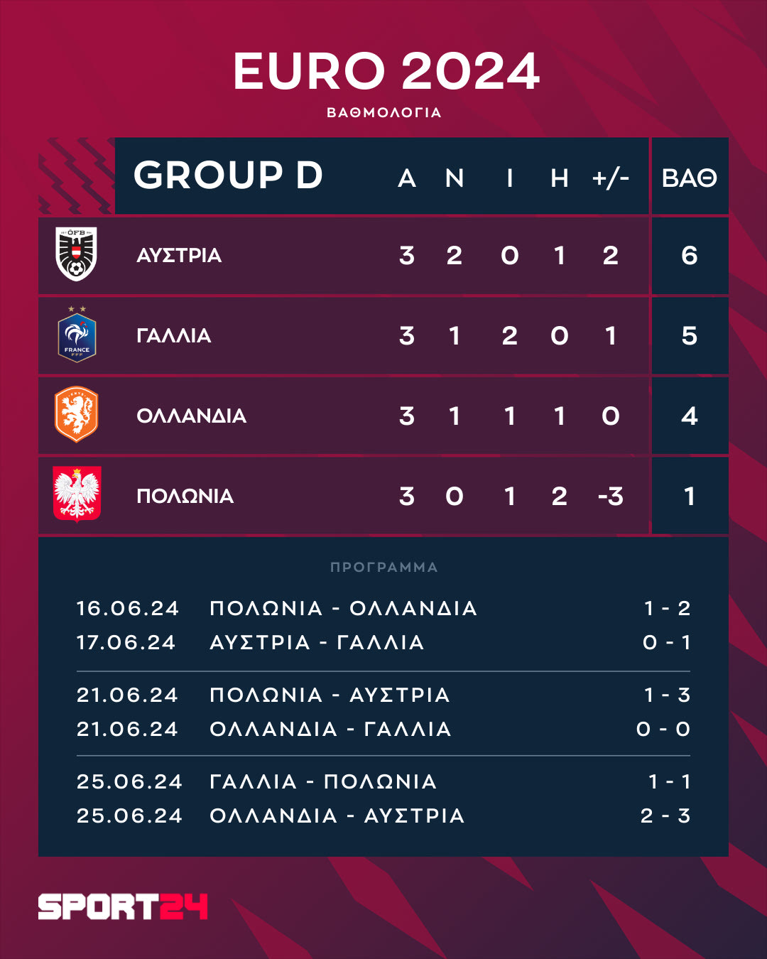 Εκπληκτική η Αυστρία, πανηγύρισε την πρώτη θέση στον 4ο όμιλο του Euro 2024. Η ομάδα του Ραλφ Ράνγκνικ επικράτησε 3-2 της Ολλανδίας, η οποία προκρίθηκε ως μία από τις καλύτερες τρίτες.