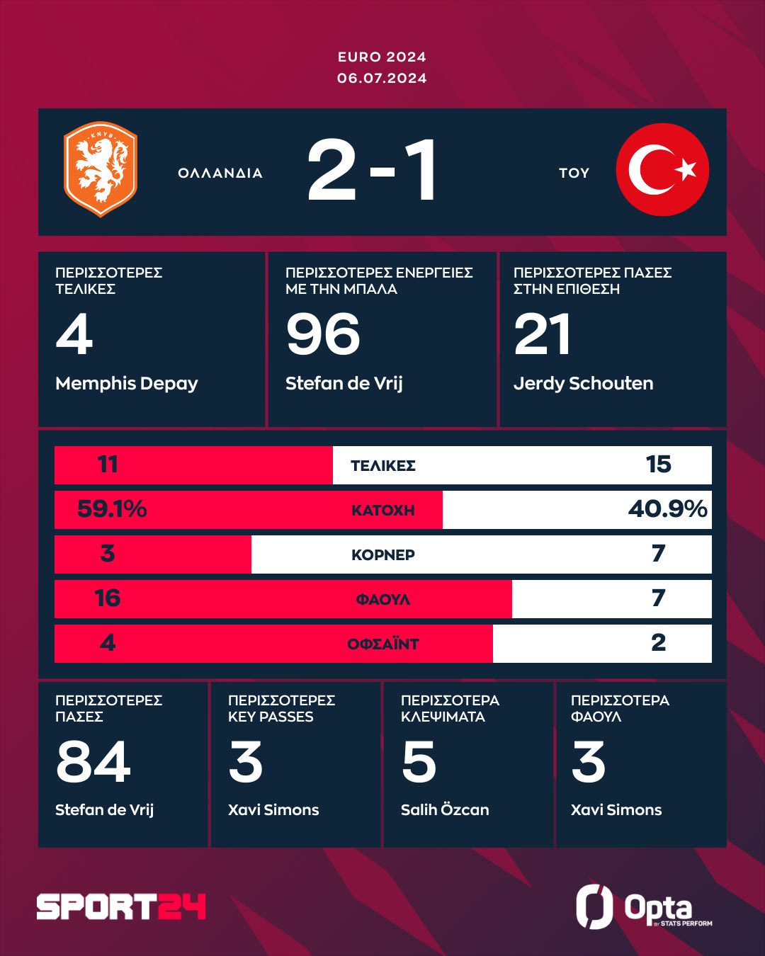 Έτσι, το 2-1 υπέρ της Ολλανδίας έμεινε έως το φινάλε, με τους οράνιε να πανηγυρίζουν σπουδαία πρόκριση στα ημιτελικά του Euro 2024.