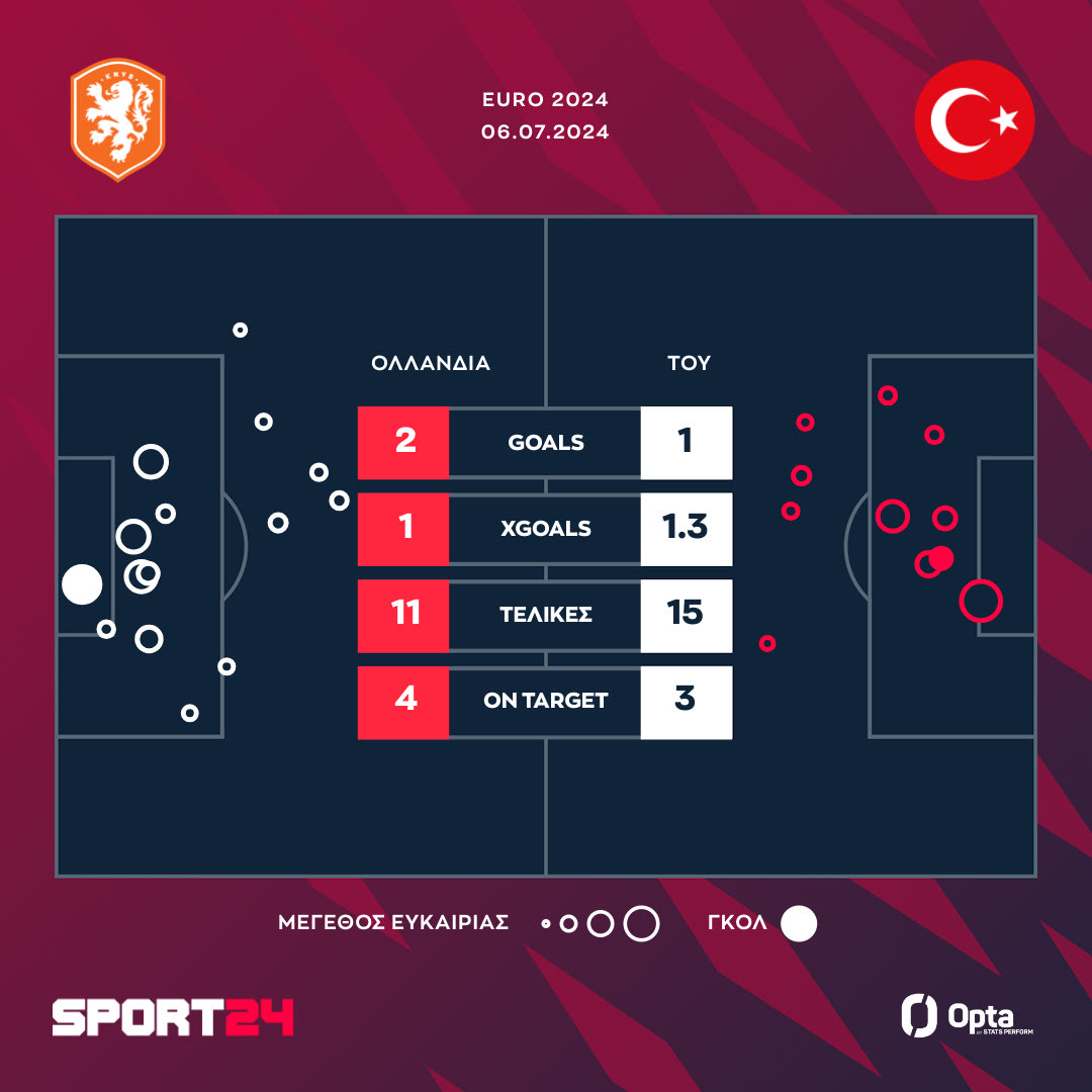 Οι Τούρκοι είχαν μπλοκάρει την Ολλανδία στο πρώτο μέρος και προηγήθηκαν με τον Ακαϊντίν στο 35′. Οι οράνιε ανέβασαν ρυθμό στο δεύτερο μέρος και χρειάστηκαν έξι λεπτά για να φέρουν το ματς… ανάποδα.