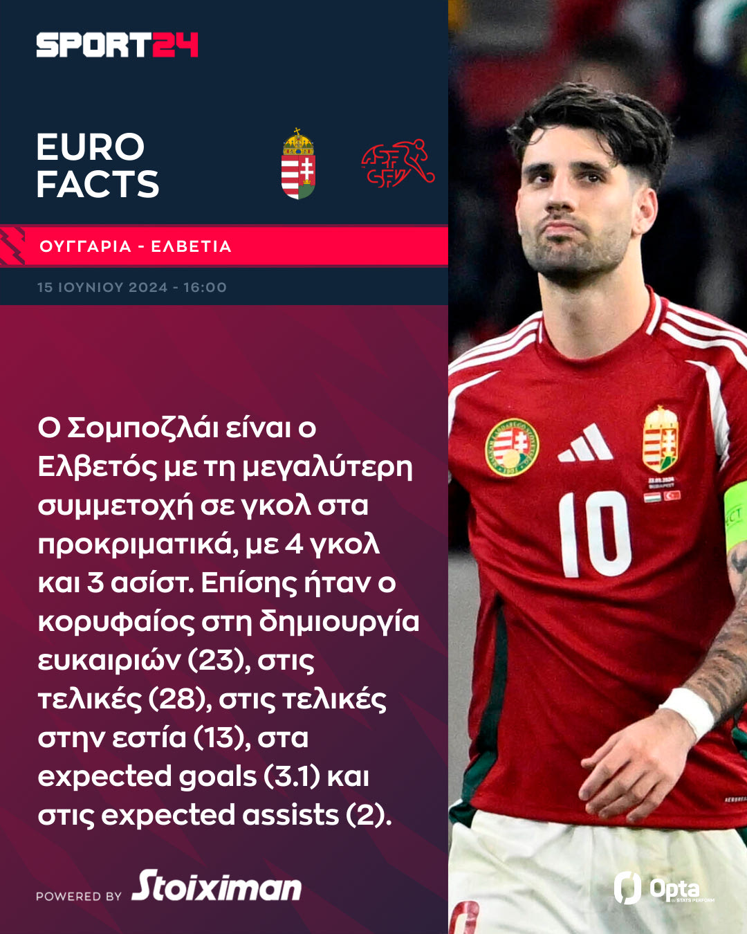 Ο Ντομινίκ Σομποσλάι είναι ο Ούγγρος με τη μεγαλύτερη συμμετοχή σε γκολ στα προκριματικά, με τέσσερα γκολ και τρεις ασίστ. Επίσης ήταν ο κορυφαίος της Ελβετίας στη δημιουργία ευκαιριών (23), στις τελικές (28), στις τελικές στην εστία (13), στις εύστοχες πάσες πάνω από τη σέντρα (256), στα expected goals (3.1) και στις expected assists (2).
