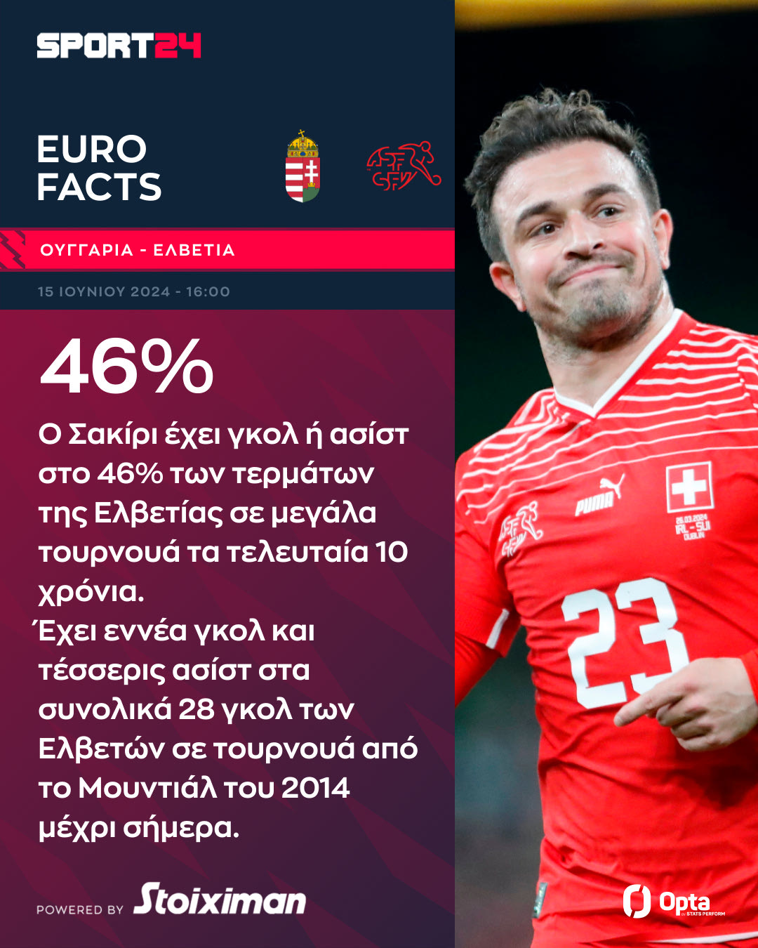 Ο Σερντάν Σακίρι έχει γκολ ή ασίστ στο 46% των τερμάτων της Ελβετίας σε μεγάλα τουρνουά τα τελευταία 10 χρόνια. Έχει εννέα γκολ και τέσσερις ασίστ στα συνολικά 28 γκολ των Ελβετών σε μεγάλα τουρνουά από το Μουντιάλ του 2014 μέχρι σήμερα.