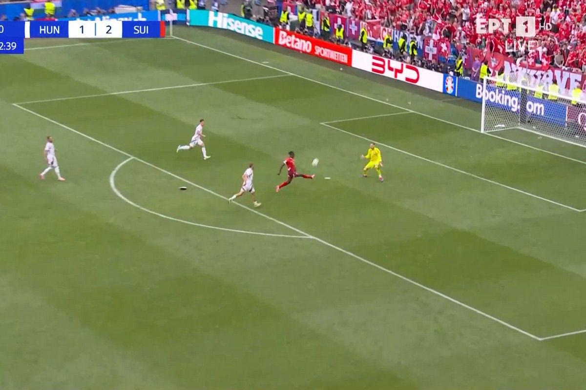 Ο Εμπολό που πέρασε ως αλλαγή στο Ουγγαρία - Ελβετία έγραψε το τελικό 1-3 με υπέροχο ψηλοκρεμαστό πλασέ την ώρα μάλιστα που είδε την επιγονατίδα που είχε στο αριστερό του πόδι να του φεύγει και να δυσκολεύει την προσπάθεια του.