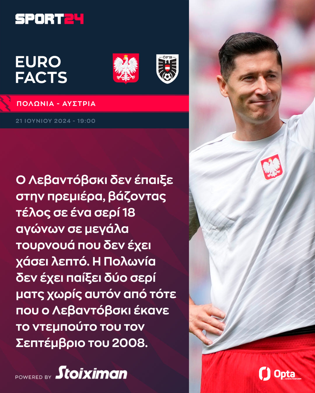 Ο Λεβαντόβσκι δεν αγωνίστηκε στην πρεμιέρα του Euro 2024, βάζοντας τέλος σε ένα σερί 18 αγώνων σε μεγάλα τουρνουά που δεν έχει χάσει ούτε λεπτό. Η Πολωνία δεν έχει παίξει δύο σερί ματς χωρίς αυτόν από τότε που ο Λεβαντόβσκι έκανε το ντεμπούτο του τον Σεπτέμβριο του 2008.