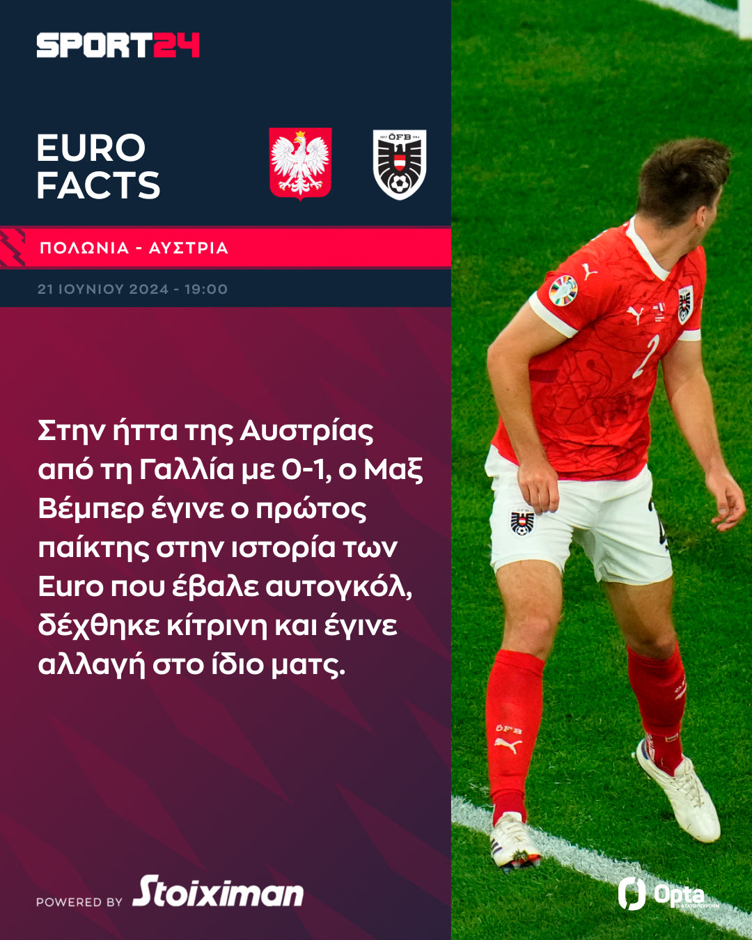 Αυτή θα είναι η δεύτερη συνάντηση Πολωνίας και Αυστρίας (19:00, ΕΡΤ1 και Live SPORT24) σε μεγάλο τουρνουά, μετά το 1-1 στον όμιλο του Euro 2008, που ήταν και ο μοναδικός βαθμός που πήραν σε εκείνη τη διοργάνωση.