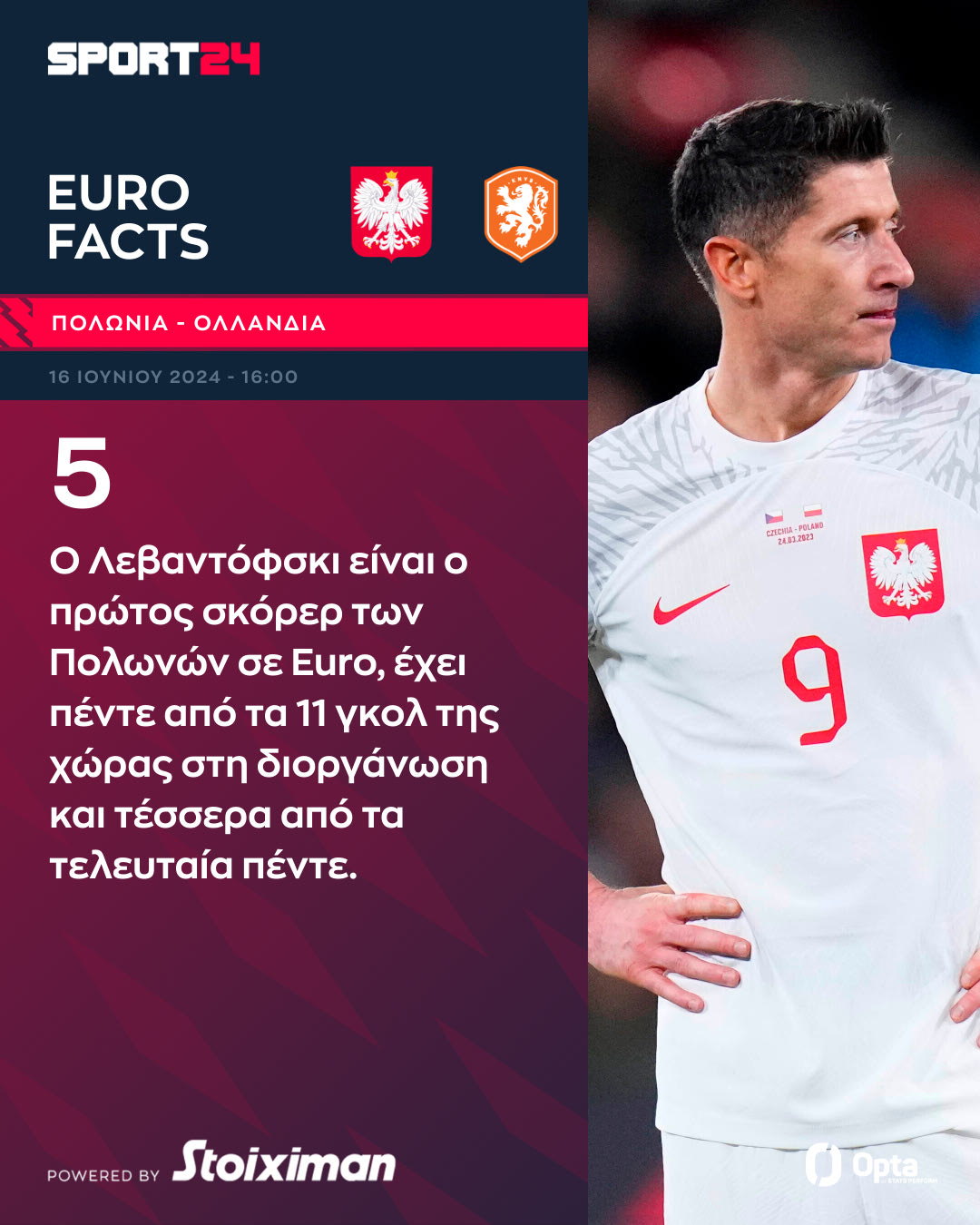 Ο Λεβαντόβσκι είναι ο πρώτος σκόρερ των Πολωνών σε Euro, έχει πέντε από τα 11 γκολ της χώρας στη διοργάνωση και τέσσερα από τα τελευταία πέντε.