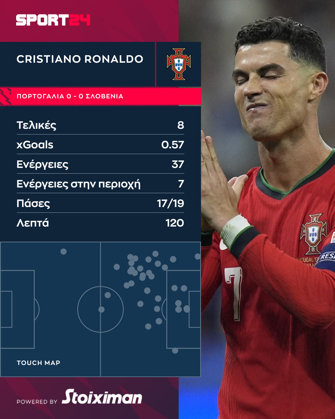 Ο CR7 είχε συνολικά 37 ενέργειες με την μπάλα, οι περισσότερες στην αριστερή πλευρά, ενώ οι επτά από αυτές ήταν στην περιοχή των Σλοβάνων. Ακόμη μία κορυφαία επίδοση στην αναμέτρηση. Άλλωστε, κινήθηκε σαν φορ αναζητώντας τον δρόμο προς το γκολ.