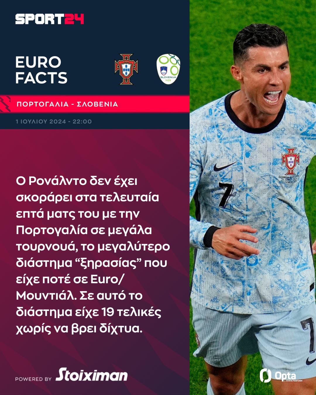 Ο Κριστιάνο Ρονάλντο δεν έχει σκοράρει στις τελευταία επτά εμφανίσεις του με την Πορτογαλία σε μεγάλα τουρνουά, το μεγαλύτερο διάστημα “ξηρασίας” που είχε ποτέ σε Euro/Μουντιάλ. Σε αυτό το διάστημα είχε 19 τελικές χωρίς να βρει δίχτυα μετά το τελευταίο του γκολ, απέναντι στην Γκάνα στο Μουντιάλ του 2022.