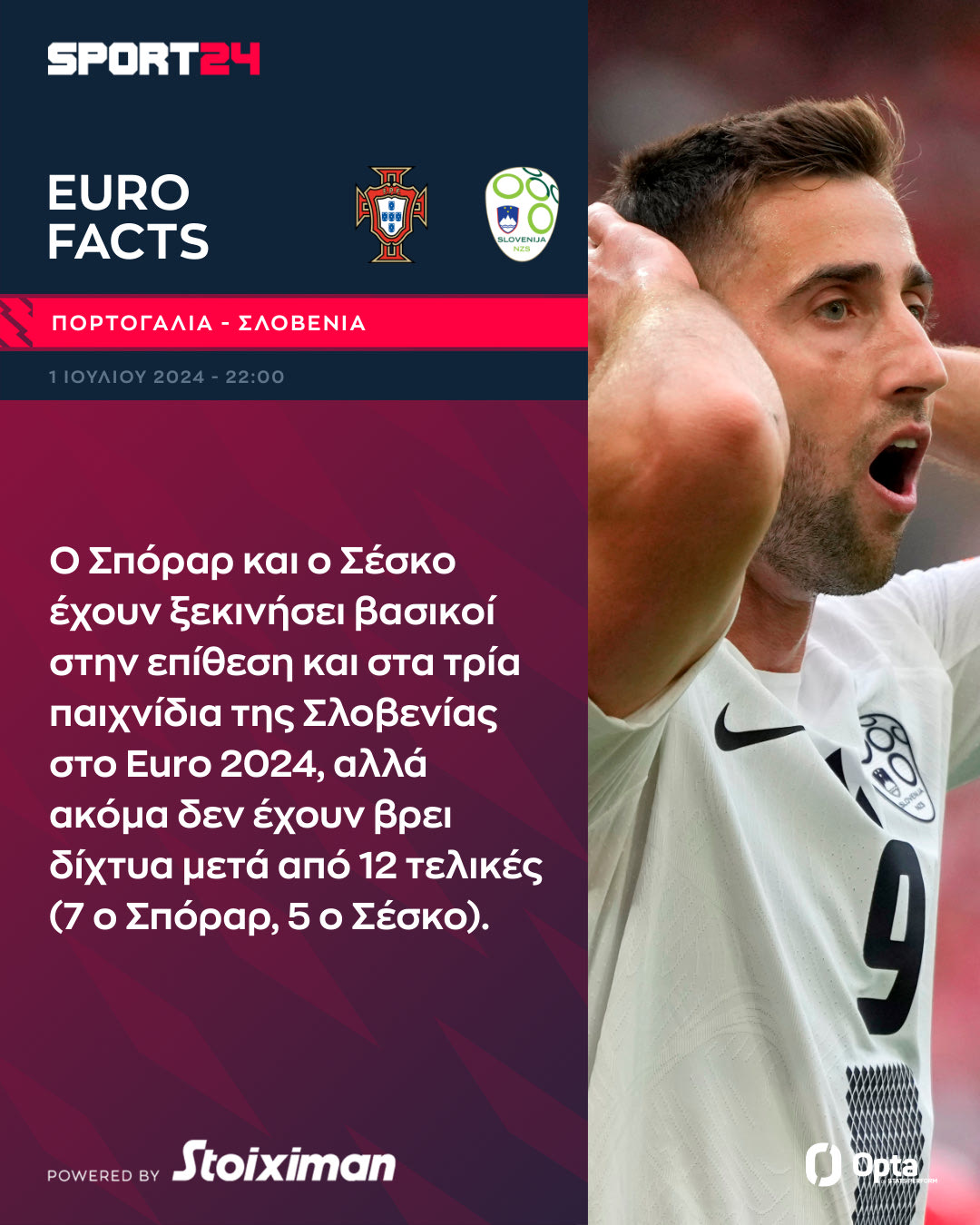 Ο Σπόραρ και ο Σέσκο έχουν ξεκινήσει βασικοί και στα τρία παιχνίδια της Σλοβενίας στο Euro 2024, αλλά ακόμα δεν έχουν βρει δίχτυα μετά από 12 τελικές (7 ο Σπόραρ, 5 ο Σέσκο).